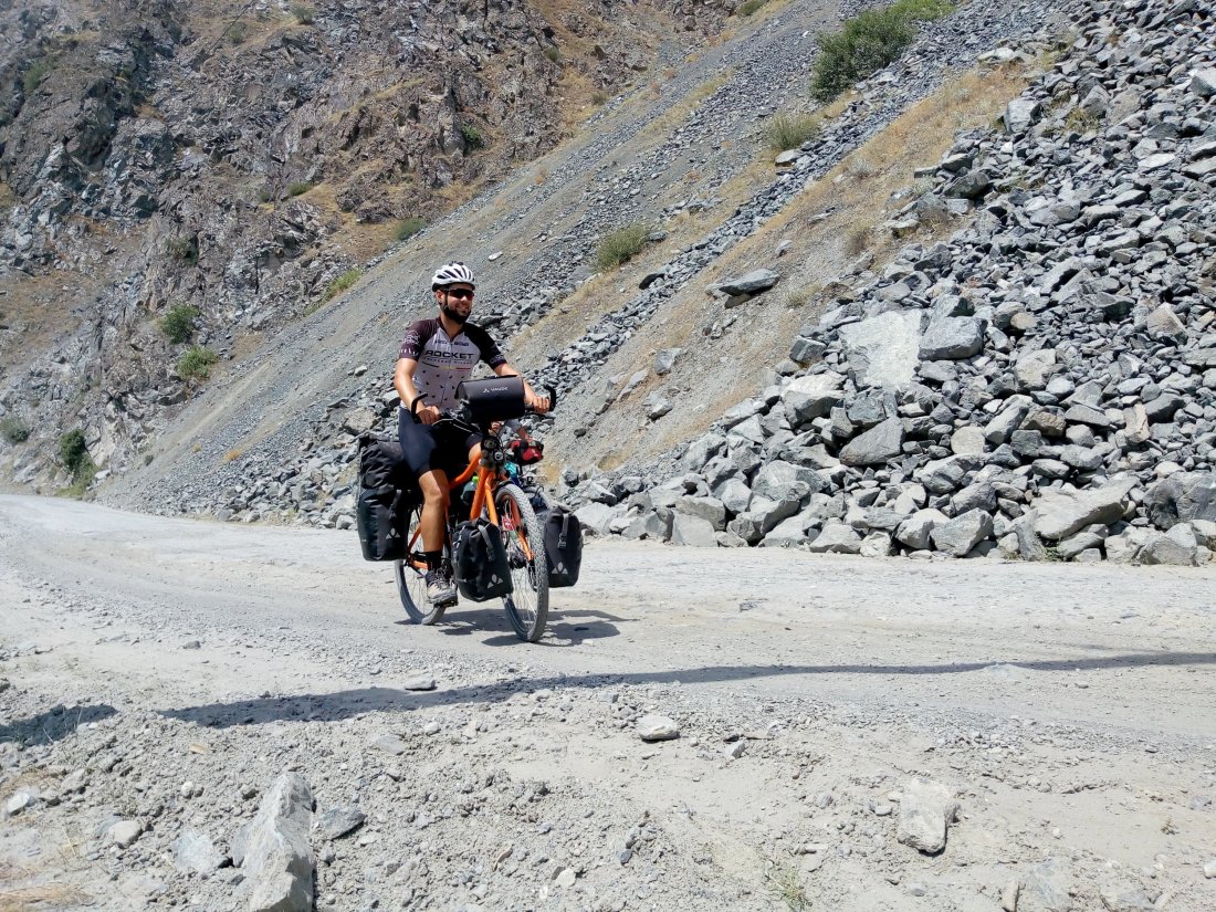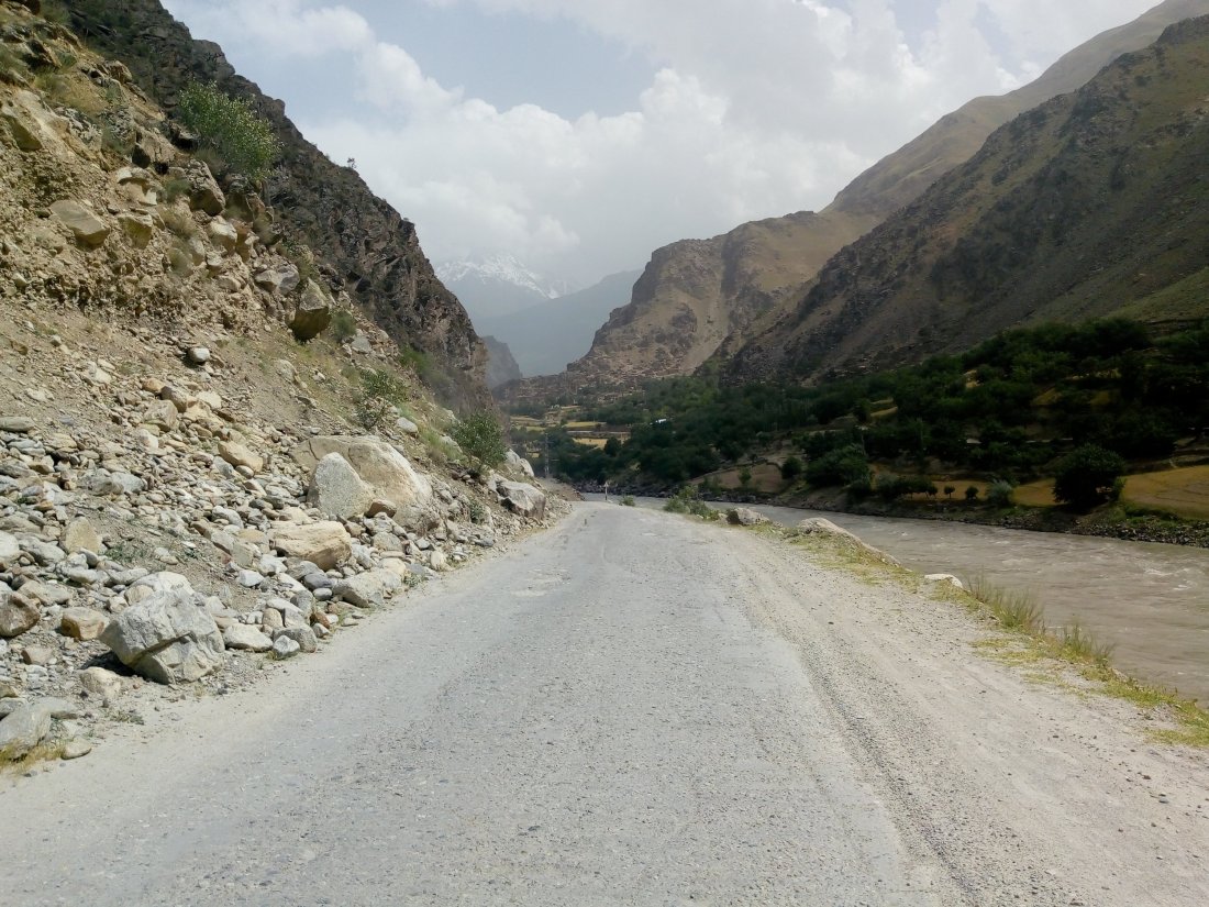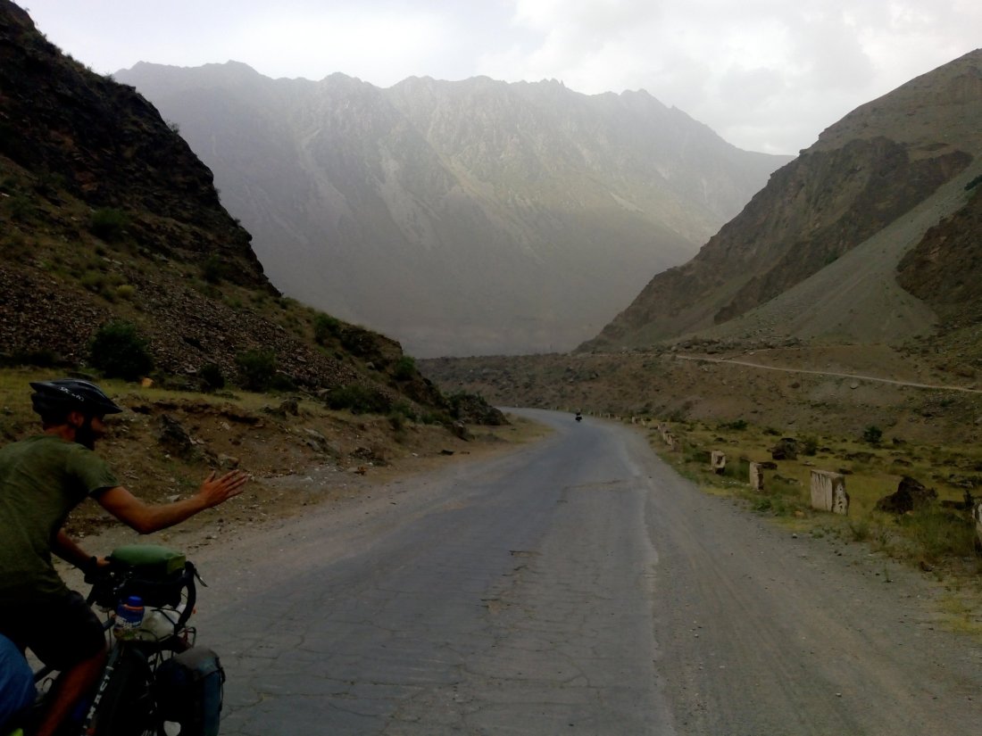 I set off from Kalaikhum with Pax and Ross, the American couple I’d met in Argentina. We soon passed Loretta, running out of town pulling her cart. Before too long Pax and Ross both had a puncture. While we were stopped to repair those, Ignace and David caught up and we went off again in a group of five.