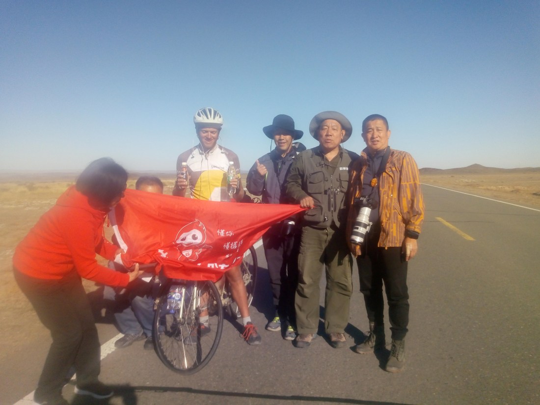 Once back on the main road I was soon out into the desert and climbing gradually upwards. A car passed me then stopped. Its occupants, a group of friendly and excitable Chinese tourists, got out of the car and greeted me. They gave me a bottle each of water and coffee, and we posed for a number of selfies. This was the sort of thing the police had been “protecting me” from yesterday!
