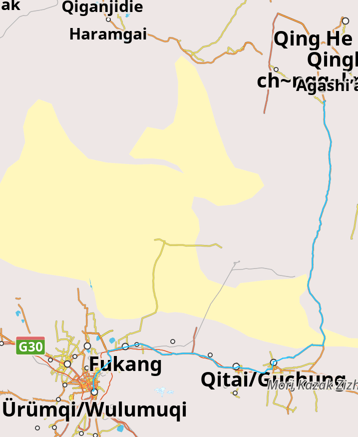 The next morning I set off early for what would be a final day of riding into Urumqi, where I planned to have a few days of rest. After a brief descent the road levelled out and I entered an urban area centred on the town of Fukang. Here was the first checkpoint of the day.