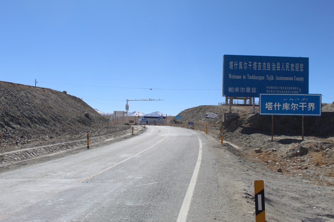 After cycling around a large pasture area, the road travelled through a narrow gorge. When the terrain opened up to another pasture, about 10km from Tashkorgan, there was a police checkpoint – because of course I couldn’t have a day of cycling without one! This was a quick one: a policeman photographed my passport and me, then waved me on.
