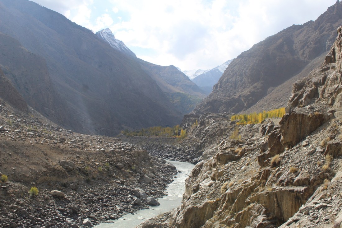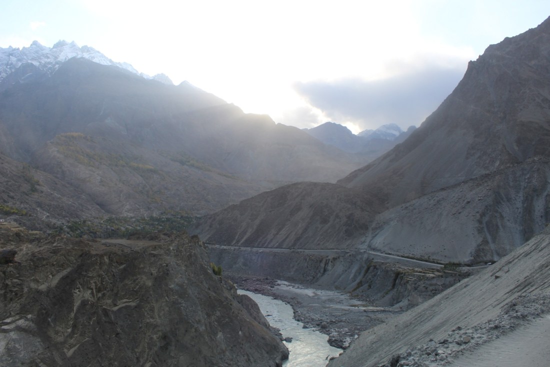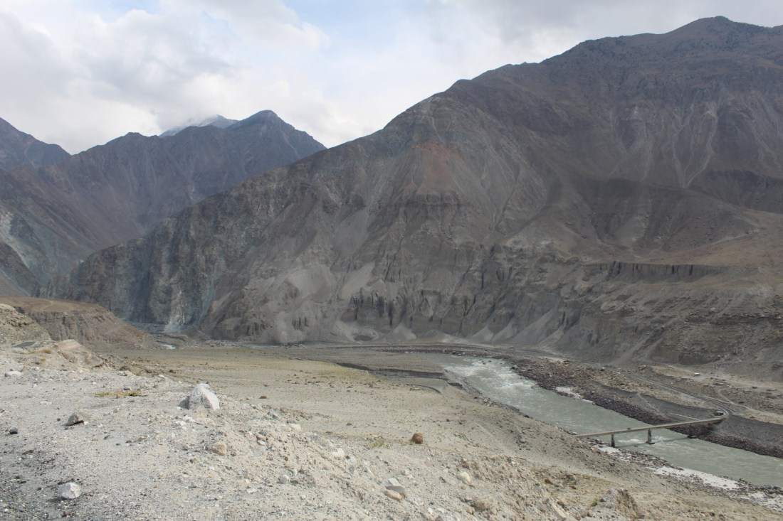 After initially riding along the Hunza river, I reached the point where it joins the Indus. This place is the junction of the world’s three highest mountain ranges: the Himalayas to the east, the Karakorum to the north and the Hindu Kush to the west.