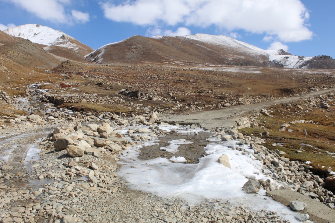 The road was indeed clear of snow, with one exception. I rode through several streams that crossed the road, one of which (at about 4000m asl) was coated in ice and snow. I pushed across that one.