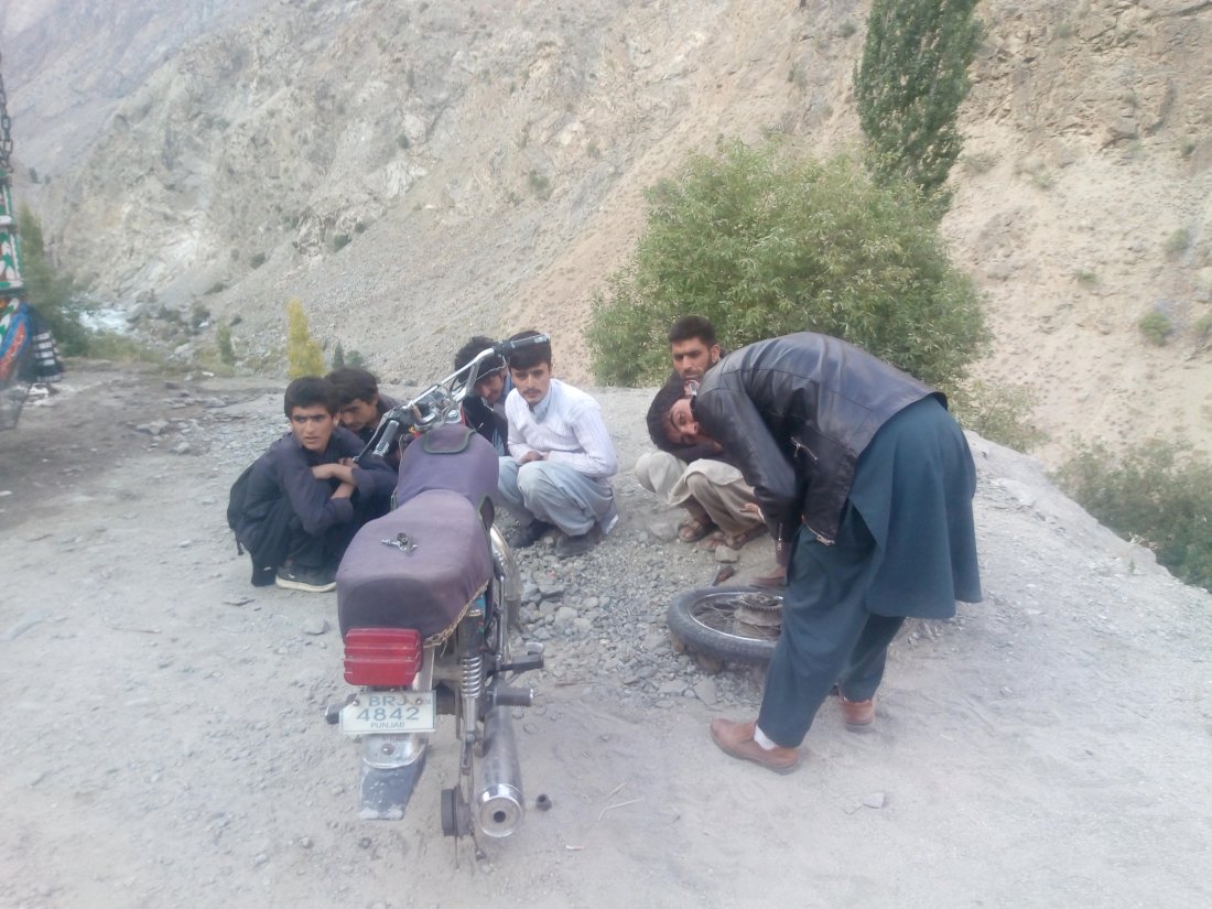 A bit of a delay came when a motorcyclist asked me to stop and help – he’d had a puncture. It took quite a while to get his tyre off, to begin with. He didn’t have tyre levers and instead used a spanner and screwdriver. This was far from the strangest part of his methods!