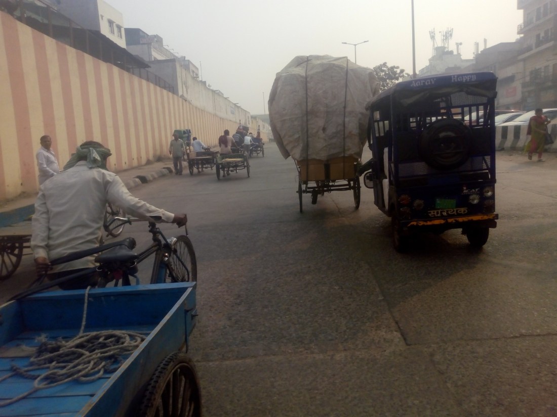 I arrived in Delhi and cycled towards the Old town. It is an enormous city so I spent a long time cycling in traffic. Oxen seem to be forbidden in the city so much of their work is done by cyclists carrying enormous loads – so big that they are often pulled or pushed on foot.