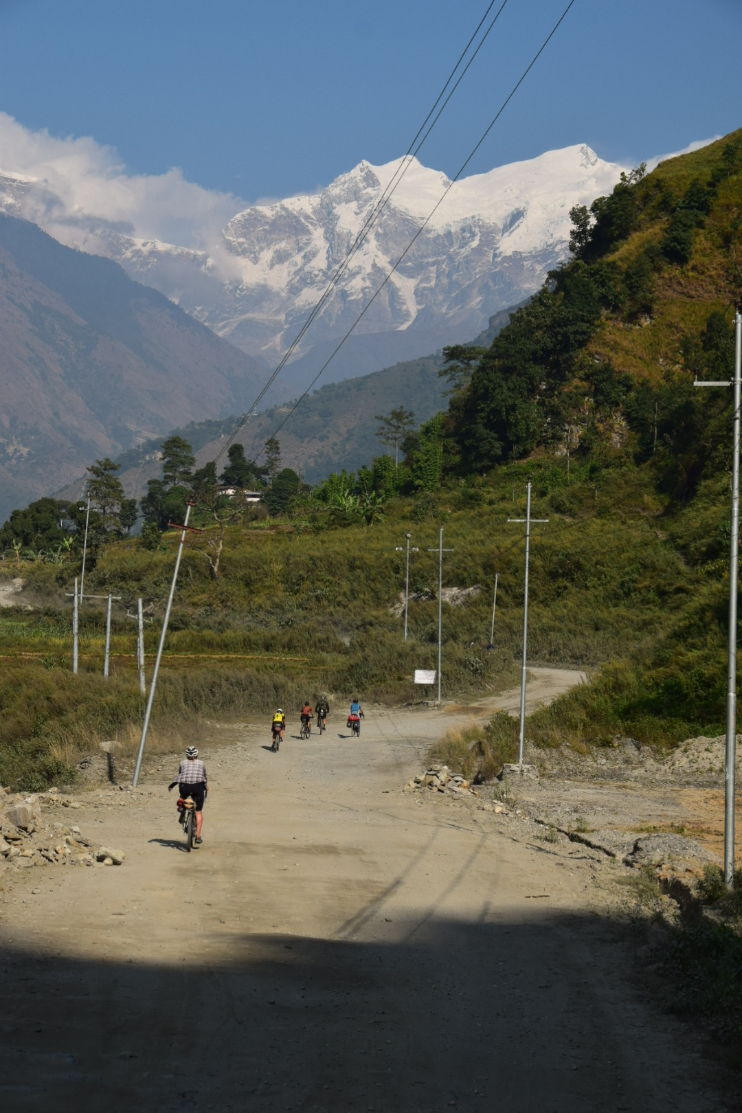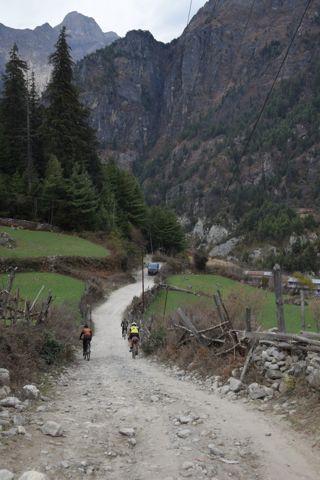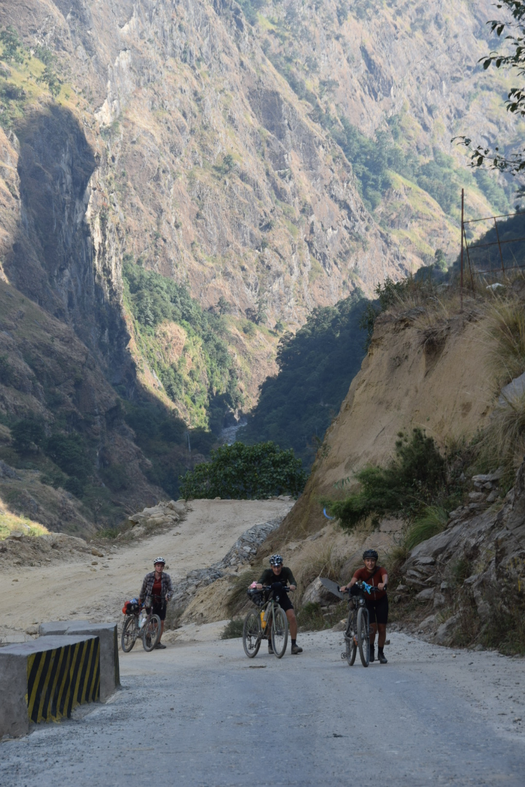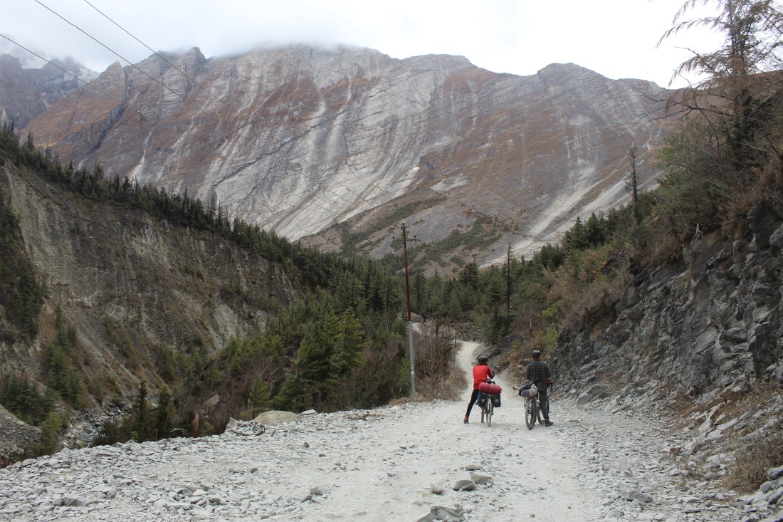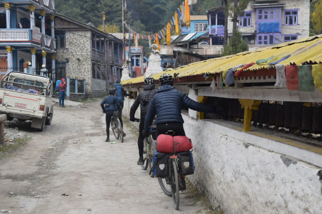 After meeting up, we cycled out of Pokhara and into the foothills of the Himalayas. It wasn’t long before we had our first problem. Silas’s bike was handling strangely. This is Silas’s fourth attempt on the Annapurna circuit – his bike keeps breaking down. He had a few problems along the way but managed to keep going this time.The tarmac roads didn’t last long, and soon we were cycling on dirt tracks, with views of mountains to our north.We ended the day in a village called Sundar Bazar and checked into a hotel. Sabina is a fierce negotiator and arranged us two rooms for a total of 1000 rupees(£7). As was often the case here, the rooms had one double bed and one single bed. I shared a room with Ross and Pax.We had a brief section of tarmac the next day as we rode into the town of Besisahar, the official start of the Annapurna Circuit. We had our permits stamped at the permit office, then continued on.For much of the Annapurna circuit a jeep track runs roughly parallel to the hiking track. We tended to stick to this, as did many of the hikers we saw. For the next couple days we slowly climbed up, following a river.The road was rough and rocky, but ridable for the most part. There were definitely a fair few steep and sandy sections that we needed to push though!We often passed waterfalls, with streams running down to the river. The road ran right through these streams.There were lots of stray dogs in the villages. We were used to being chased by dogs in most other countries but here, as in India, the dogs were remarkably well behaved and friendly.On the fourth day we reached 2500m above sea level. This is the point where altitude sickness can start to be a problem, and we passed a military/medical crew setting up a station next to the road. They offered to check our pulse and blood pressure/oxygenation. We all passed!We ended that day in the village of Chame, at an altitude of around 2700m. The hotel was nice enough but the next morning we decided to go to a local restaurant for a much cheaper breakfast. There was a long row of spinning barrels running through the village. I think they’re supposed to give good luck.I had a few things to sort on my bike, so I was the last one to head over to the restaurant. As is usual in the area, there were lots of dogs around. By now I’d got used to them, though, so I paid them little mind. It came as quite a shock, then, when one of them bit me on the back of the leg!I kicked out at the dog and it ran off. I continued over to the restaurant to meet the others, and took off my trouser leg to look at the bite. It had broken the skin but was an odd shape, a cut rather than a bite. I had been wearing trousers and leg warmers, and neither seemed to have been broken. I guessed it was more a case of one tooth catching and dragging along, rather than a bite per se.The cut was very shallow, and since there had been two layers of clothing in the way, it seemed unlikely any saliva would have got through. Rabies is something of a problem in Nepal, though, and being 100% fatal it really isn’t something I wanted to risk. I asked around about where would be the nearest place I could get the post-exposure vaccines. As luck would have it, there was a hospital in this town that had them!Silas and I wandered off in search of this hospital, and found it closed. He did a great job of washing out the wound while we waited. We waited quite a while beside what seemed like the main entrance to the hospital (a rather grandiose name for the small clinic). Eventually we found out that, while we were waiting, a doctor had arrived via what had seemed like a back entrance.