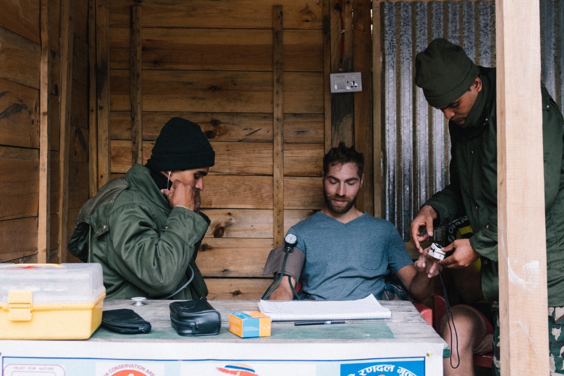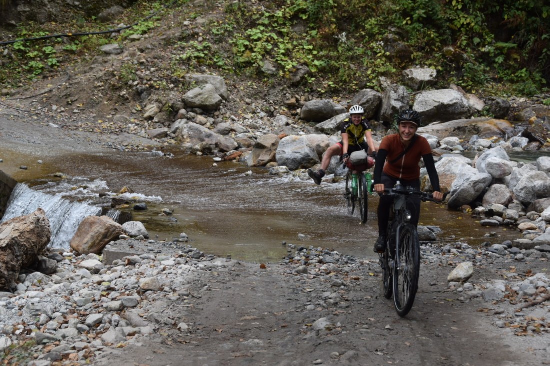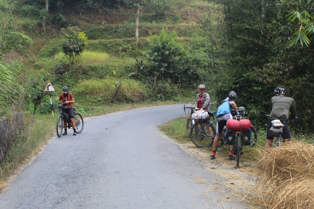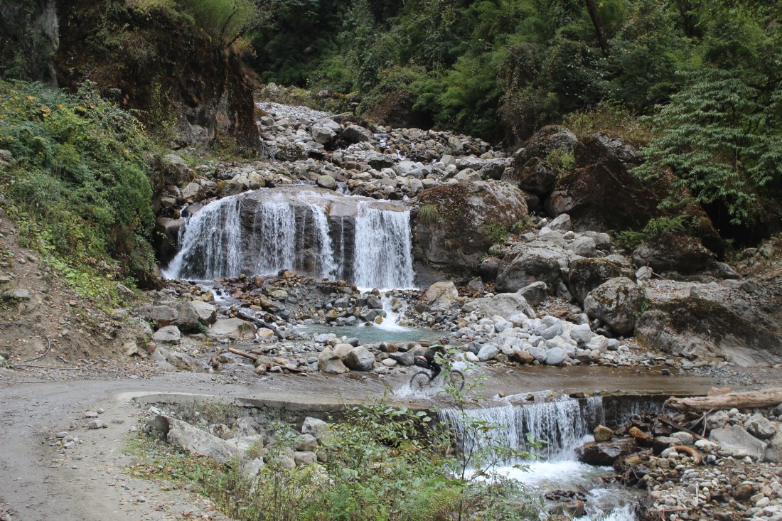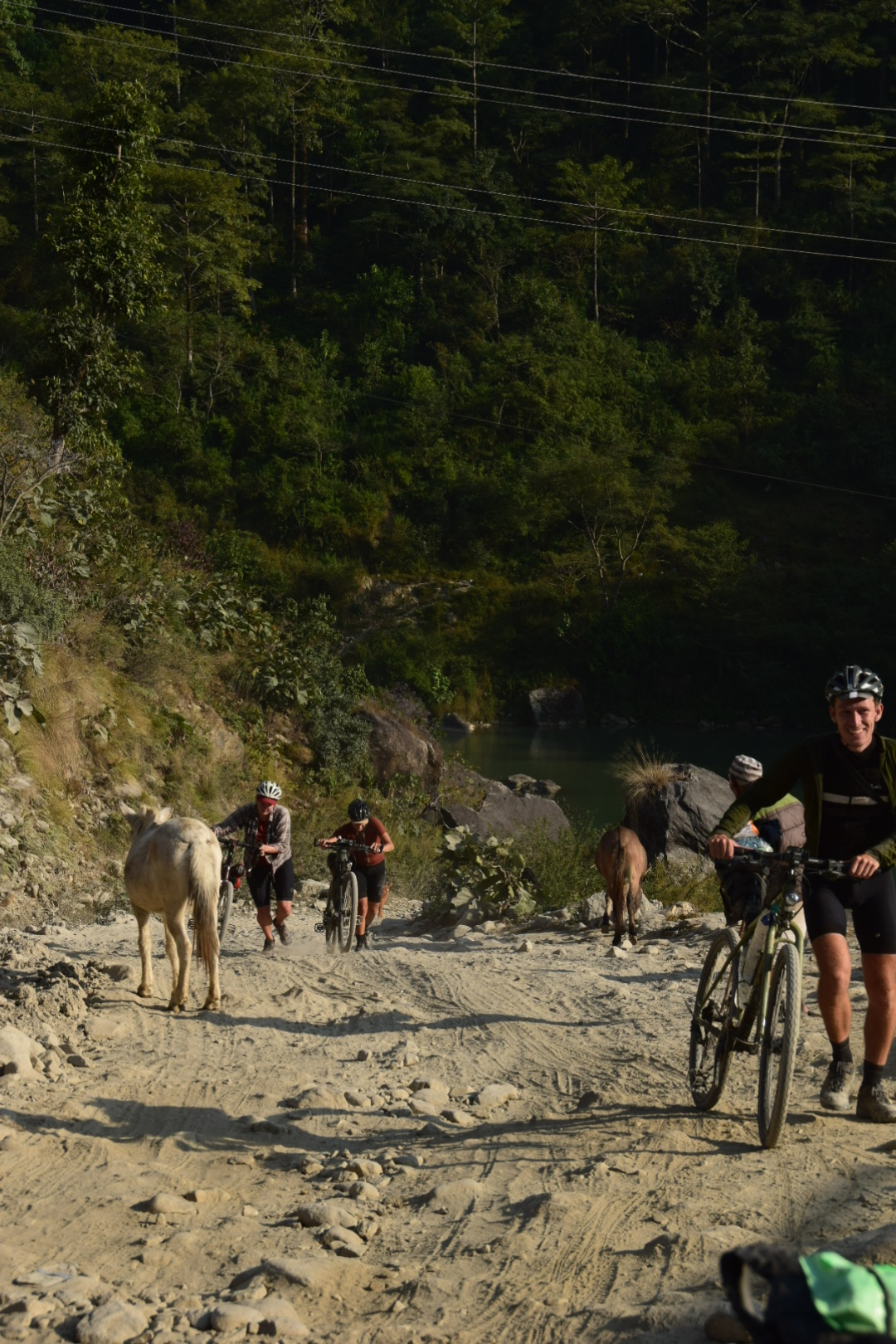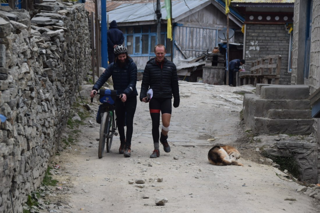 After meeting up, we cycled out of Pokhara and into the foothills of the Himalayas. It wasn’t long before we had our first problem. Silas’s bike was handling strangely. This is Silas’s fourth attempt on the Annapurna circuit – his bike keeps breaking down. He had a few problems along the way but managed to keep going this time.The tarmac roads didn’t last long, and soon we were cycling on dirt tracks, with views of mountains to our north.We ended the day in a village called Sundar Bazar and checked into a hotel. Sabina is a fierce negotiator and arranged us two rooms for a total of 1000 rupees(£7). As was often the case here, the rooms had one double bed and one single bed. I shared a room with Ross and Pax.We had a brief section of tarmac the next day as we rode into the town of Besisahar, the official start of the Annapurna Circuit. We had our permits stamped at the permit office, then continued on.For much of the Annapurna circuit a jeep track runs roughly parallel to the hiking track. We tended to stick to this, as did many of the hikers we saw. For the next couple days we slowly climbed up, following a river.The road was rough and rocky, but ridable for the most part. There were definitely a fair few steep and sandy sections that we needed to push though!We often passed waterfalls, with streams running down to the river. The road ran right through these streams.There were lots of stray dogs in the villages. We were used to being chased by dogs in most other countries but here, as in India, the dogs were remarkably well behaved and friendly.On the fourth day we reached 2500m above sea level. This is the point where altitude sickness can start to be a problem, and we passed a military/medical crew setting up a station next to the road. They offered to check our pulse and blood pressure/oxygenation. We all passed!We ended that day in the village of Chame, at an altitude of around 2700m. The hotel was nice enough but the next morning we decided to go to a local restaurant for a much cheaper breakfast. There was a long row of spinning barrels running through the village. I think they’re supposed to give good luck.I had a few things to sort on my bike, so I was the last one to head over to the restaurant. As is usual in the area, there were lots of dogs around. By now I’d got used to them, though, so I paid them little mind. It came as quite a shock, then, when one of them bit me on the back of the leg!I kicked out at the dog and it ran off. I continued over to the restaurant to meet the others, and took off my trouser leg to look at the bite. It had broken the skin but was an odd shape, a cut rather than a bite. I had been wearing trousers and leg warmers, and neither seemed to have been broken. I guessed it was more a case of one tooth catching and dragging along, rather than a bite per se.The cut was very shallow, and since there had been two layers of clothing in the way, it seemed unlikely any saliva would have got through. Rabies is something of a problem in Nepal, though, and being 100% fatal it really isn’t something I wanted to risk. I asked around about where would be the nearest place I could get the post-exposure vaccines. As luck would have it, there was a hospital in this town that had them!Silas and I wandered off in search of this hospital, and found it closed. He did a great job of washing out the wound while we waited. We waited quite a while beside what seemed like the main entrance to the hospital (a rather grandiose name for the small clinic). Eventually we found out that, while we were waiting, a doctor had arrived via what had seemed like a back entrance.