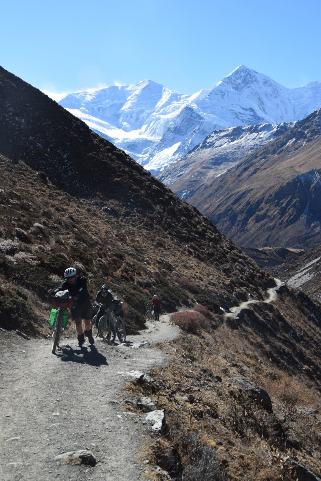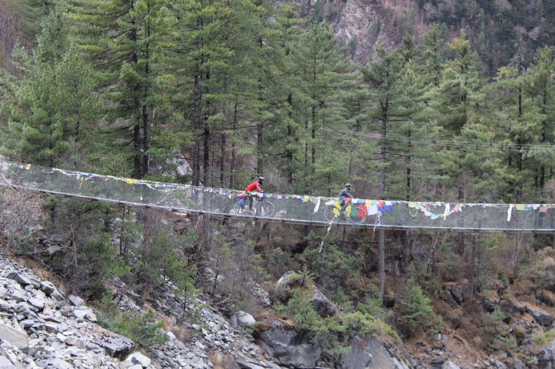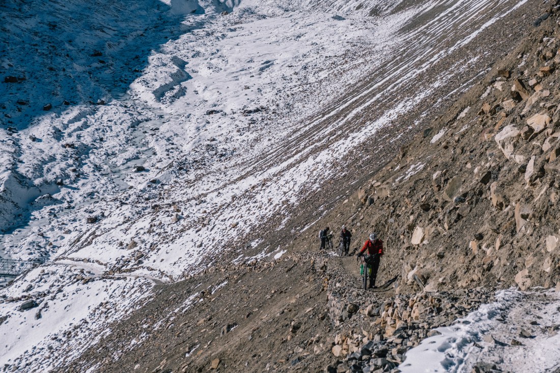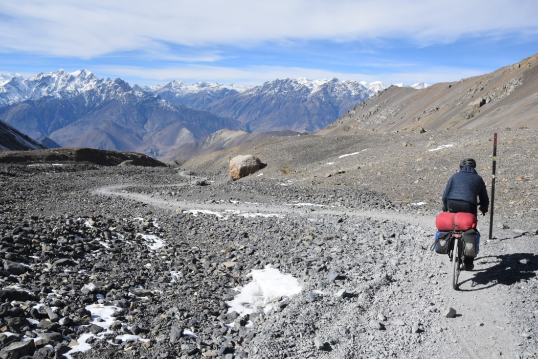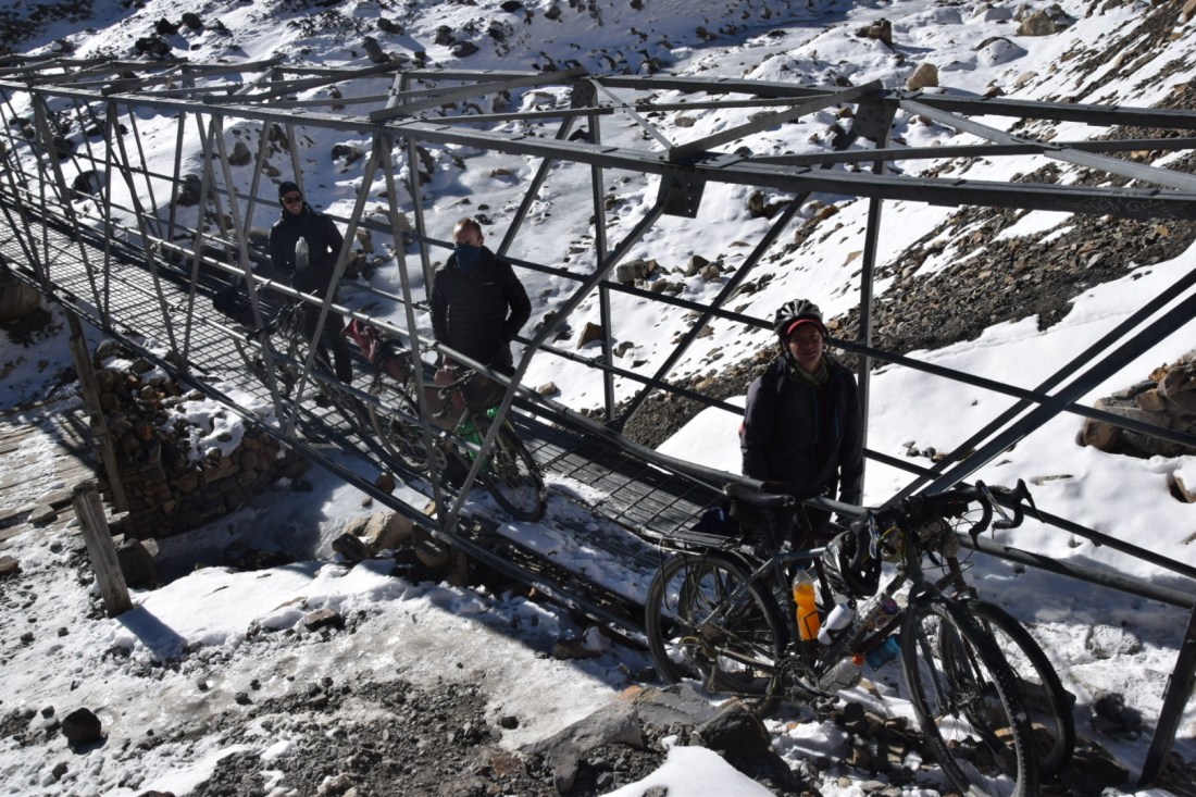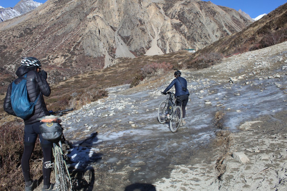 The doctor had a look and confirmed that they could give me the rabies and tetanus vaccines. Perhaps due to the odd shape of the wound, he described it on the chart as an “alleged” dog bite! Silas took some photos of the nurse giving me a rabies shot in each arm. Thankfully he refrained from photographing the tetanus vaccine, which was injected into my buttock!It was all done pretty quickly and I only had to pay 2000 rupees (£13) for the whole thing – which would include the two further courses of vaccine I needed to get in 3 and 7 days. For way of contrast, the cost in the US is about $500 per course!Ross had come to the hospital during all this and I’d asked him to tell Robin, Sabina and Pax that they should feel free to make a start as Ross, Silas and I would be able to catch them up. Silas and I walked back to the bikes, me sporting the ridiculously over-the-top bandage the nurse had given me.Silas replaced that bandage with a more minimalist one, and we set off cycling. We were starting to get quite high up now and the scenery was changing, with evergreen trees rather than farmlands, and some impressive rock faces.The road was at times just a narrow track carved into the side of the cliff. Some of the corners looked particularly precarious and at one point we saw a vehicle that had crashed into the river below.The road crossed over to the other side of the river and climbed somewhat more steeply for the next few kilometres.There was a mountain bike trail on the other side which Ross and Silas wanted to ride down. I wasn’t too keen on the idea so I rode on ahead and soon caught up with Robin, Sabina and Pax, who had just stopped for lunch at a cafe. It was called “The Bob Marley Cafe.” There was marijuana growing outside and the guy offered to sell us some, but we declined.After the cafe the road conditions were pretty good for the rest of the day; quite smooth and generally flat too. There was one small climb up to a stupa which had amazing views both ahead and behind.From there we rode toward the town of Manang, our goal for the day. This town was noteworthy as it marks the end of the road. From here the going would get significantly more tough.We spent two days in Manang. Silas went for a two-day hike-a-bike and the others went on a hike on one of the days, but I mostly lazed around and enjoyed the good food and incredible views.In order to get my next Rabies vaccine, I had to ride back to Chame. I then planned to ride back to Manang, and on to catch up with the others – effectively doing three days of riding in one! I therefore set off as soon as it got light, in pretty cold weather and with a fair bit of ice on the ground.I made good enough time and the Chame hospital opened a few minutes after I arrived. I got the vaccine quickly and rode back to Manang, stopping to chat for a while with a friendly group of hikers on the way.I had got used to not eating much over the last few days as the riding was somewhat shorter than I was used to. I didn’t adjust this now that I was back to riding at my pace and exhausted myself by going too long without eating. The section just after Manang involved carrying the bike up several series of stairs, with which I rather struggled.Even after the stairs the trail was pretty narrow and often unrideable. There were no longer any vehicles here, and supplies are carried either by people or by ponies.I finally caught up with the others in Yak Khorla, just as it was beginning to get dark. I was pretty ravenous by then and rather enjoyed my yak steak!The day after Yak Khorla involved a lot of pushing! This day took us from 4000m to 4500m, and the reduced oxygen was definitely making itself felt in how out of breath we were. A few of the others had some headaches due to the altitude but I was fine.When the trail crossed to the other side of the valley, it did so via a remarkable suspension bridge. Riding across this was pretty unnerving.We reached “base camp” at about midday. This was where we planned to sleep for the night, before taking on the pass tomorrow.After dropping off my bike, I went back to help the others. While I was carrying everything I had, they had left most of their stuff in Pokhara. It really was amazing the difference 10kg or so made. After struggling to push my bike up, I was jogging along with Sabina’s bike!We took lunch at the base camp then dropped most of our stuff in our rooms. Our plan was to push the bikes up as far as we could today, then return here to sleep. The next day over the pass would be a long one so we wanted to do as much as we could today.The first stretch was a real challenge. For about a kilometre the trail averaged a gradient of something like 30%. It was a real grueling slog to get the bikes up, switchbacking left and right on rough terrain.The trail straightened for the last push to high camp, but now had a light covering of snow. At the high camp we dropped our bikes and went back to help the others up the last stretch. We’d considered leaving the bikes here but as there was still a fair bit of light left I advocated trying to get as far as we could.From here the snow was quite deep, and there was a bit of a drop to our side. I went first, trying to dig in as much as possible with my feet to create footholds for the others.Robin and Sabina were feeling pretty tired, so they left their bikes first and set off back to base camp.The rest of us continued on to a bridge, where we locked up our bikes. I’d hoped we’d be able to collect water here tomorrow but the river was frozen solid. I picked up a heavy rock and dropped it from the bridge; it bounced.The return to base camp was obviously much quicker than the way up! We made it back and Silas, Ross, Pax and I spent an enjoyable evening playing Tichu. This was a bizarre Swiss card game that Silas had taught us. We ended up playing it most nights of the trip.The next morning was our earliest start. We’d taken as much stuff off the 
