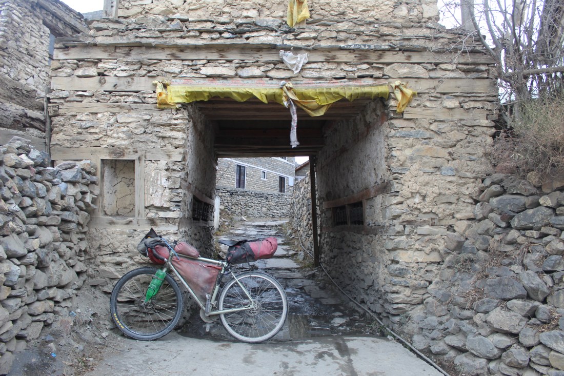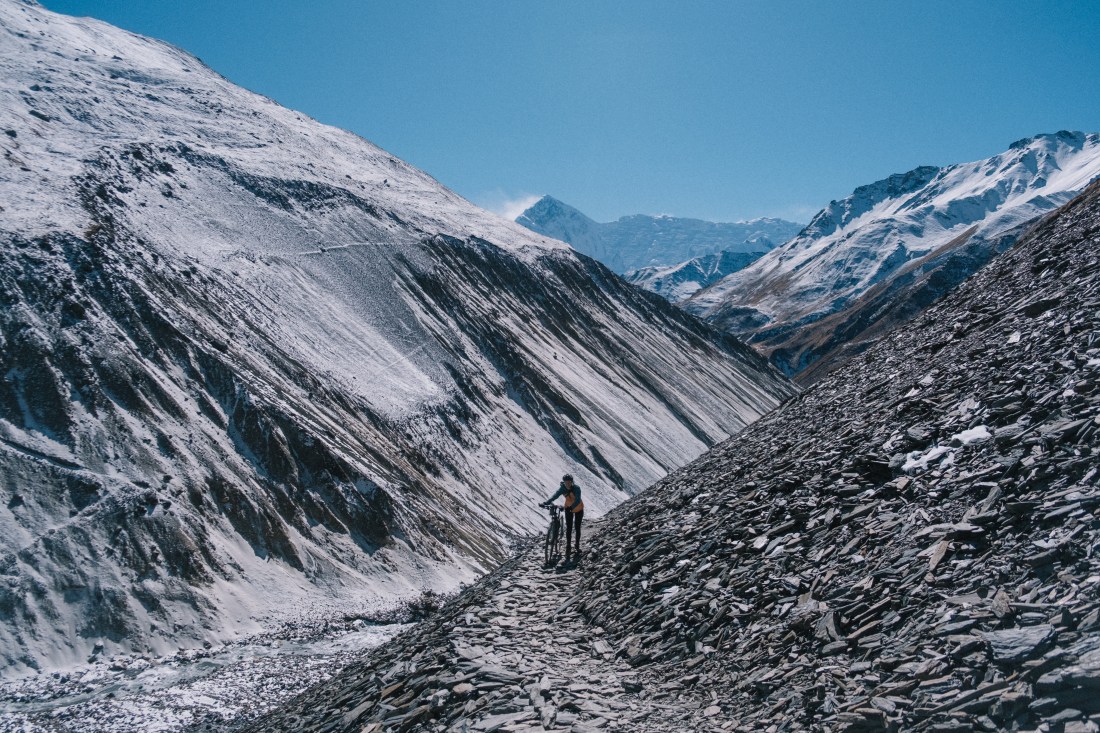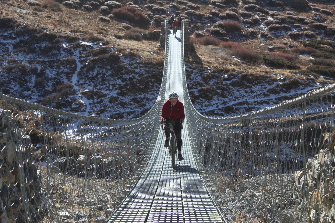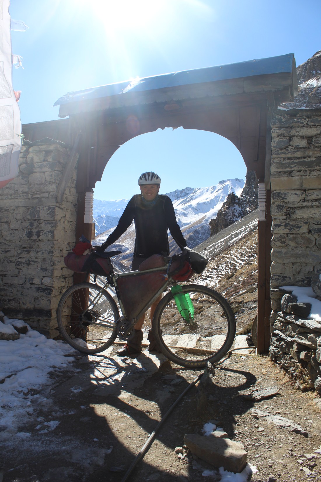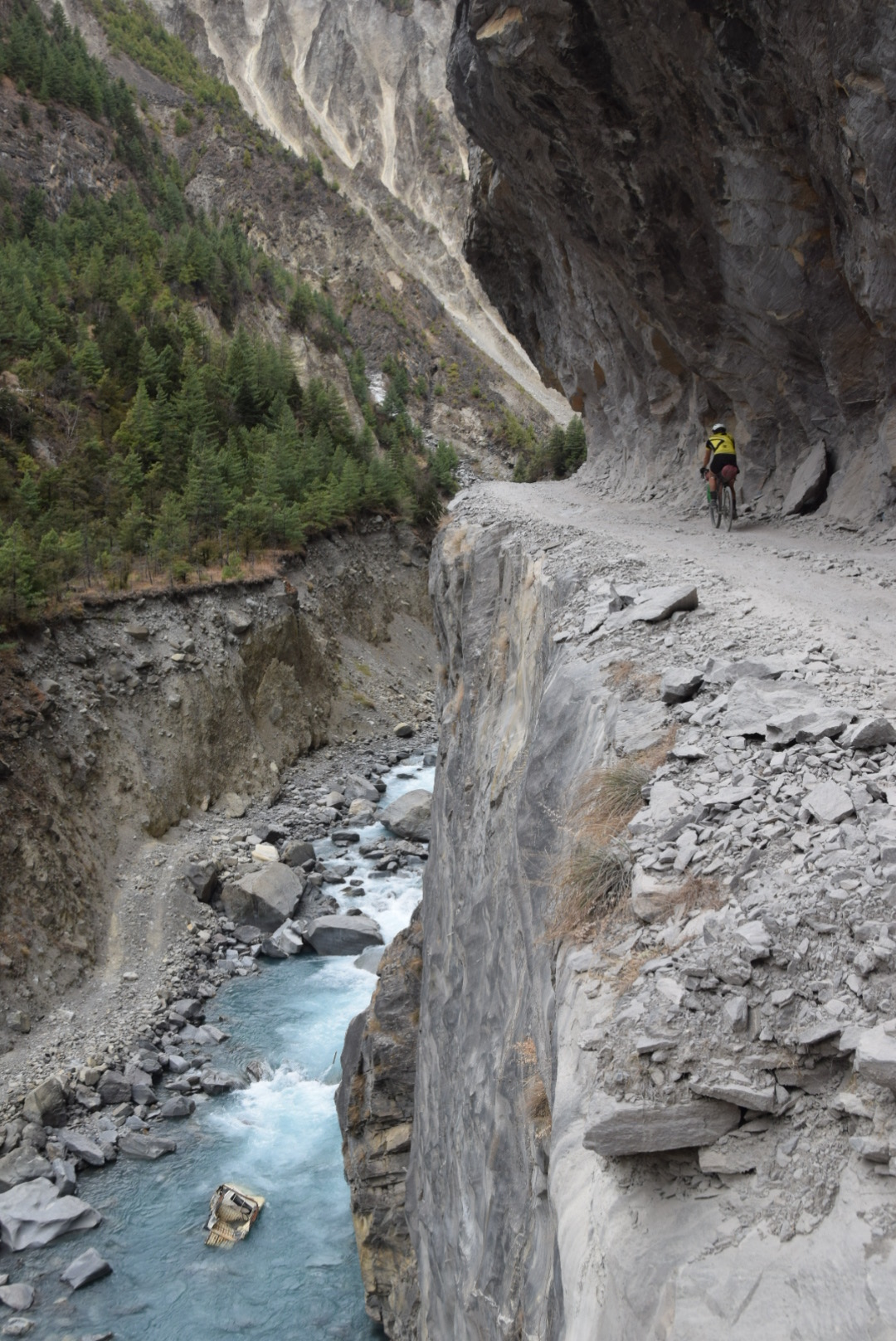 The doctor had a look and confirmed that they could give me the rabies and tetanus vaccines. Perhaps due to the odd shape of the wound, he described it on the chart as an “alleged” dog bite! Silas took some photos of the nurse giving me a rabies shot in each arm. Thankfully he refrained from photographing the tetanus vaccine, which was injected into my buttock!It was all done pretty quickly and I only had to pay 2000 rupees (£13) for the whole thing – which would include the two further courses of vaccine I needed to get in 3 and 7 days. For way of contrast, the cost in the US is about $500 per course!Ross had come to the hospital during all this and I’d asked him to tell Robin, Sabina and Pax that they should feel free to make a start as Ross, Silas and I would be able to catch them up. Silas and I walked back to the bikes, me sporting the ridiculously over-the-top bandage the nurse had given me.Silas replaced that bandage with a more minimalist one, and we set off cycling. We were starting to get quite high up now and the scenery was changing, with evergreen trees rather than farmlands, and some impressive rock faces.The road was at times just a narrow track carved into the side of the cliff. Some of the corners looked particularly precarious and at one point we saw a vehicle that had crashed into the river below.The road crossed over to the other side of the river and climbed somewhat more steeply for the next few kilometres.There was a mountain bike trail on the other side which Ross and Silas wanted to ride down. I wasn’t too keen on the idea so I rode on ahead and soon caught up with Robin, Sabina and Pax, who had just stopped for lunch at a cafe. It was called “The Bob Marley Cafe.” There was marijuana growing outside and the guy offered to sell us some, but we declined.After the cafe the road conditions were pretty good for the rest of the day; quite smooth and generally flat too. There was one small climb up to a stupa which had amazing views both ahead and behind.From there we rode toward the town of Manang, our goal for the day. This town was noteworthy as it marks the end of the road. From here the going would get significantly more tough.We spent two days in Manang. Silas went for a two-day hike-a-bike and the others went on a hike on one of the days, but I mostly lazed around and enjoyed the good food and incredible views.In order to get my next Rabies vaccine, I had to ride back to Chame. I then planned to ride back to Manang, and on to catch up with the others – effectively doing three days of riding in one! I therefore set off as soon as it got light, in pretty cold weather and with a fair bit of ice on the ground.I made good enough time and the Chame hospital opened a few minutes after I arrived. I got the vaccine quickly and rode back to Manang, stopping to chat for a while with a friendly group of hikers on the way.I had got used to not eating much over the last few days as the riding was somewhat shorter than I was used to. I didn’t adjust this now that I was back to riding at my pace and exhausted myself by going too long without eating. The section just after Manang involved carrying the bike up several series of stairs, with which I rather struggled.Even after the stairs the trail was pretty narrow and often unrideable. There were no longer any vehicles here, and supplies are carried either by people or by ponies.I finally caught up with the others in Yak Khorla, just as it was beginning to get dark. I was pretty ravenous by then and rather enjoyed my yak steak!The day after Yak Khorla involved a lot of pushing! This day took us from 4000m to 4500m, and the reduced oxygen was definitely making itself felt in how out of breath we were. A few of the others had some headaches due to the altitude but I was fine.When the trail crossed to the other side of the valley, it did so via a remarkable suspension bridge. Riding across this was pretty unnerving.We reached “base camp” at about midday. This was where we planned to sleep for the night, before taking on the pass tomorrow.After dropping off my bike, I went back to help the others. While I was carrying everything I had, they had left most of their stuff in Pokhara. It really was amazing the difference 10kg or so made. After struggling to push my bike up, I was jogging along with Sabina’s bike!We took lunch at the base camp then dropped most of our stuff in our rooms. Our plan was to push the bikes up as far as we could today, then return here to sleep. The next day over the pass would be a long one so we wanted to do as much as we could today.The first stretch was a real challenge. For about a kilometre the trail averaged a gradient of something like 30%. It was a real grueling slog to get the bikes up, switchbacking left and right on rough terrain.The trail straightened for the last push to high camp, but now had a light covering of snow. At the high camp we dropped our bikes and went back to help the others up the last stretch. We’d considered leaving the bikes here but as there was still a fair bit of light left I advocated trying to get as far as we could.From here the snow was quite deep, and there was a bit of a drop to our side. I went first, trying to dig in as much as possible with my feet to create footholds for the others.Robin and Sabina were feeling pretty tired, so they left their bikes first and set off back to base camp.The rest of us continued on to a bridge, where we locked up our bikes. I’d hoped we’d be able to collect water here tomorrow but the river was frozen solid. I picked up a heavy rock and dropped it from the bridge; it bounced.The return to base camp was obviously much quicker than the way up! We made it back and Silas, Ross, Pax and I spent an enjoyable evening playing Tichu. This was a bizarre Swiss card game that Silas had taught us. We ended up playing it most nights of the trip.The next morning was our earliest start. We’d taken as much stuff off the 