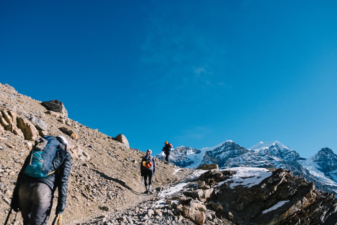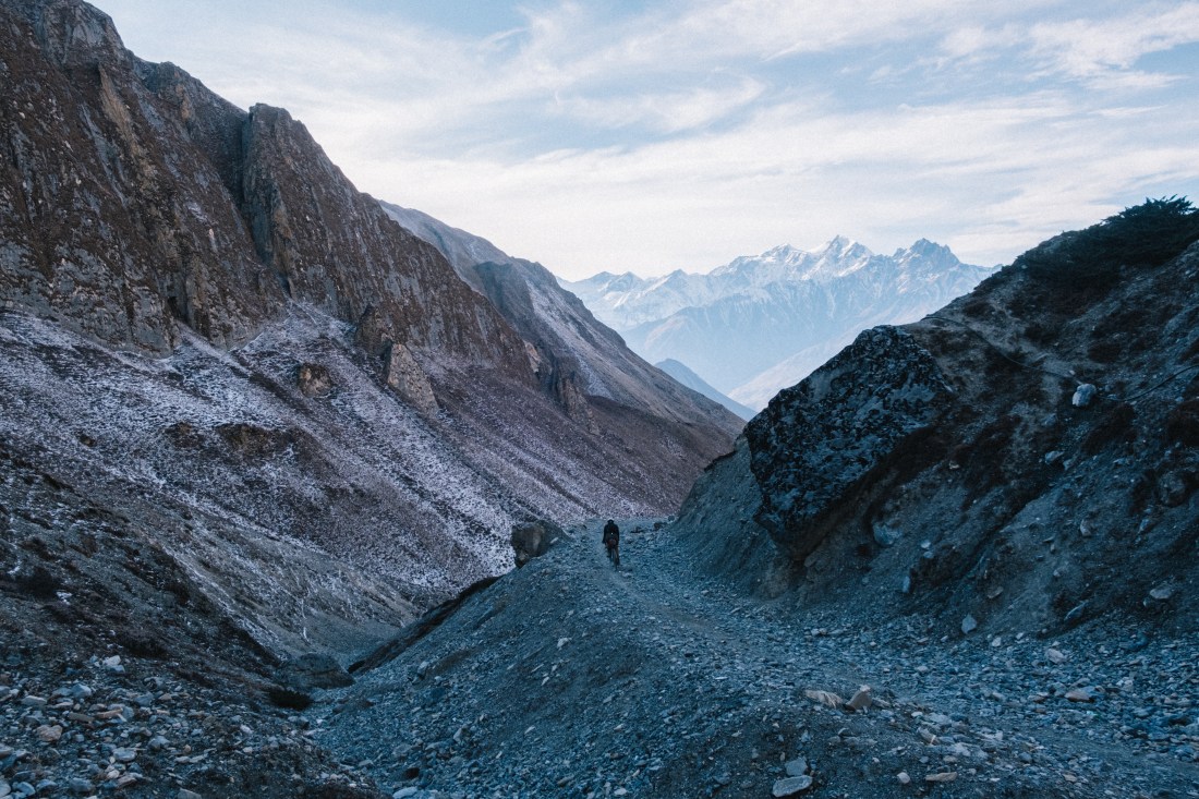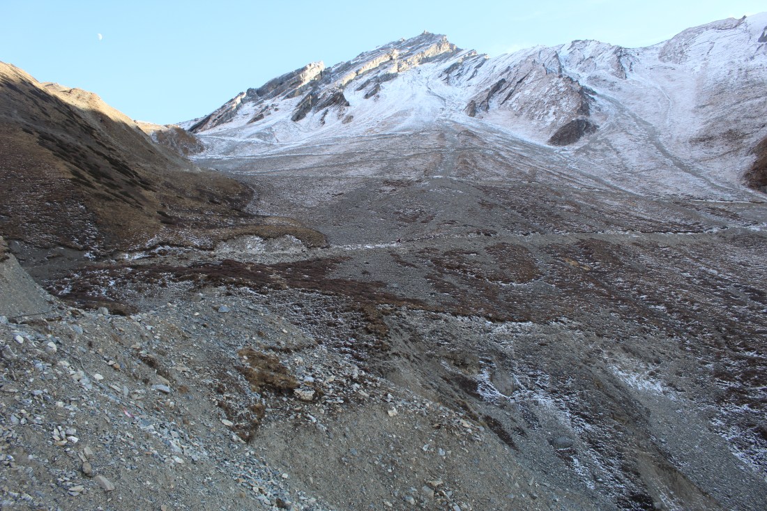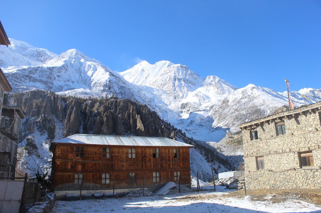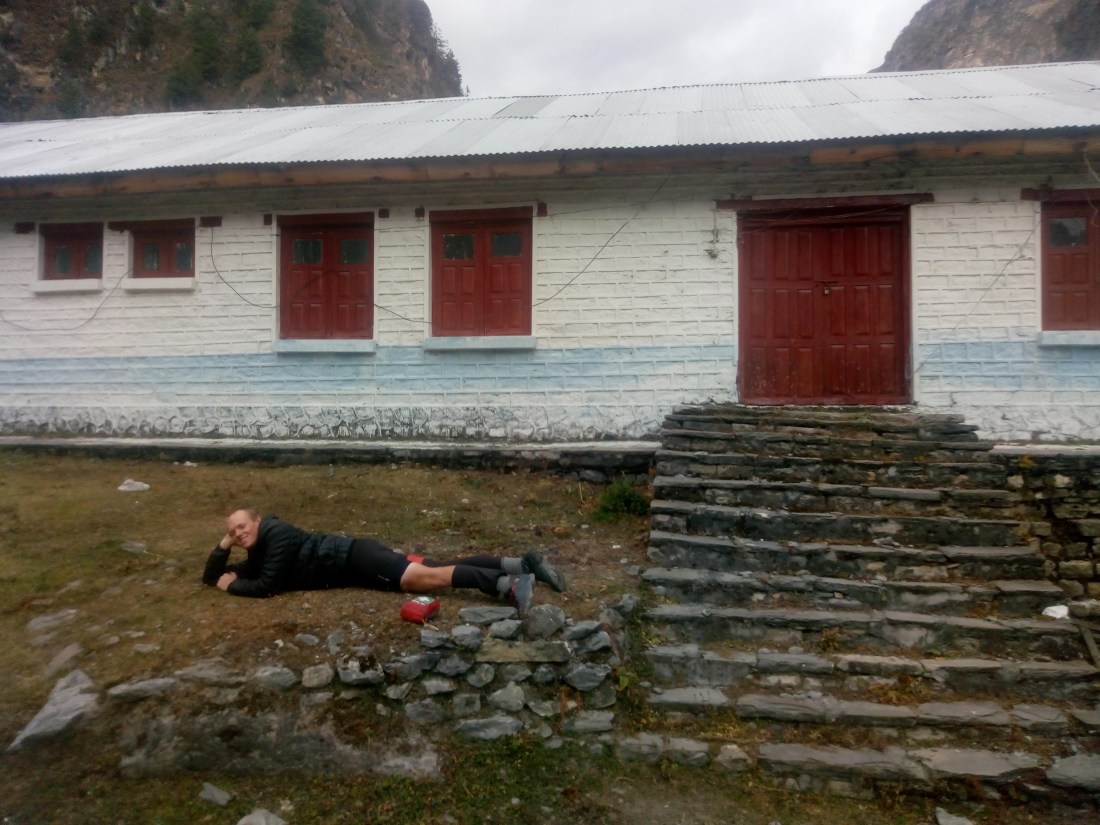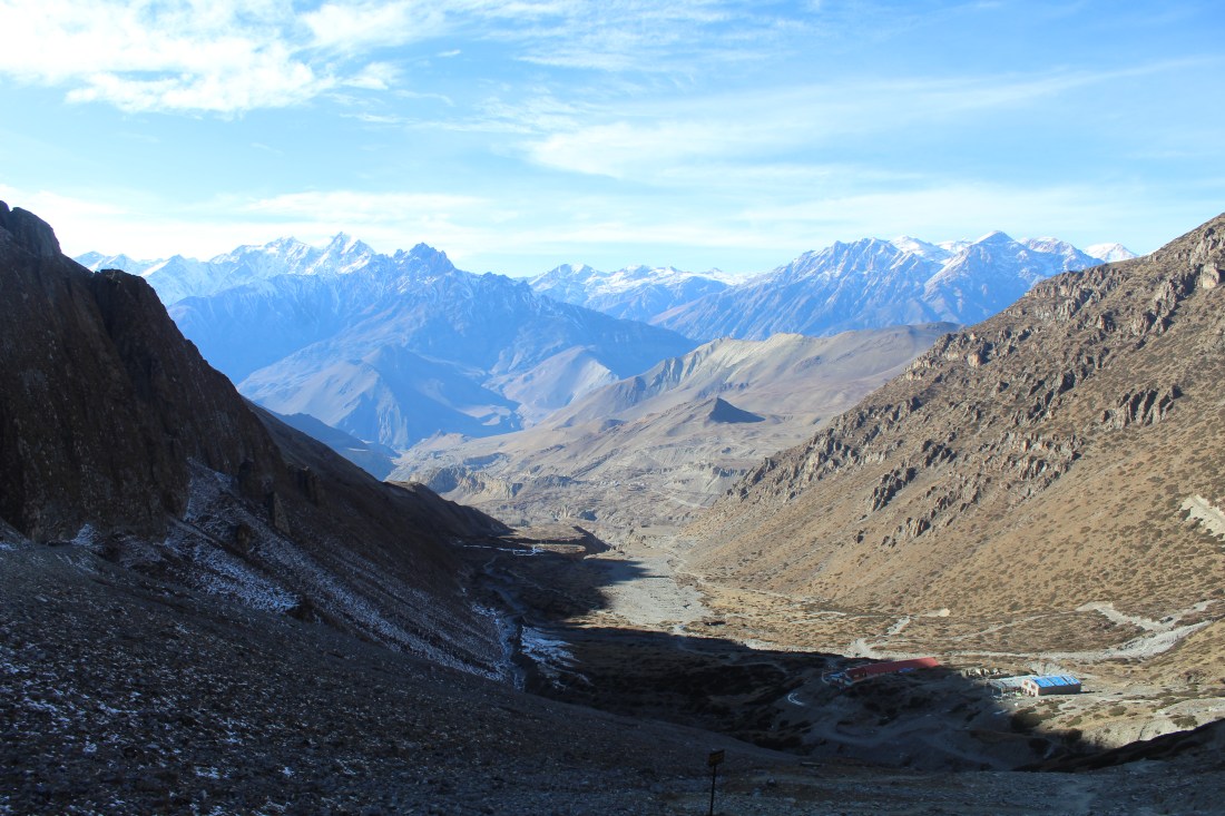 The doctor had a look and confirmed that they could give me the rabies and tetanus vaccines. Perhaps due to the odd shape of the wound, he described it on the chart as an “alleged” dog bite! Silas took some photos of the nurse giving me a rabies shot in each arm. Thankfully he refrained from photographing the tetanus vaccine, which was injected into my buttock!It was all done pretty quickly and I only had to pay 2000 rupees (£13) for the whole thing – which would include the two further courses of vaccine I needed to get in 3 and 7 days. For way of contrast, the cost in the US is about $500 per course!Ross had come to the hospital during all this and I’d asked him to tell Robin, Sabina and Pax that they should feel free to make a start as Ross, Silas and I would be able to catch them up. Silas and I walked back to the bikes, me sporting the ridiculously over-the-top bandage the nurse had given me.Silas replaced that bandage with a more minimalist one, and we set off cycling. We were starting to get quite high up now and the scenery was changing, with evergreen trees rather than farmlands, and some impressive rock faces.The road was at times just a narrow track carved into the side of the cliff. Some of the corners looked particularly precarious and at one point we saw a vehicle that had crashed into the river below.The road crossed over to the other side of the river and climbed somewhat more steeply for the next few kilometres.There was a mountain bike trail on the other side which Ross and Silas wanted to ride down. I wasn’t too keen on the idea so I rode on ahead and soon caught up with Robin, Sabina and Pax, who had just stopped for lunch at a cafe. It was called “The Bob Marley Cafe.” There was marijuana growing outside and the guy offered to sell us some, but we declined.After the cafe the road conditions were pretty good for the rest of the day; quite smooth and generally flat too. There was one small climb up to a stupa which had amazing views both ahead and behind.From there we rode toward the town of Manang, our goal for the day. This town was noteworthy as it marks the end of the road. From here the going would get significantly more tough.We spent two days in Manang. Silas went for a two-day hike-a-bike and the others went on a hike on one of the days, but I mostly lazed around and enjoyed the good food and incredible views.In order to get my next Rabies vaccine, I had to ride back to Chame. I then planned to ride back to Manang, and on to catch up with the others – effectively doing three days of riding in one! I therefore set off as soon as it got light, in pretty cold weather and with a fair bit of ice on the ground.I made good enough time and the Chame hospital opened a few minutes after I arrived. I got the vaccine quickly and rode back to Manang, stopping to chat for a while with a friendly group of hikers on the way.I had got used to not eating much over the last few days as the riding was somewhat shorter than I was used to. I didn’t adjust this now that I was back to riding at my pace and exhausted myself by going too long without eating. The section just after Manang involved carrying the bike up several series of stairs, with which I rather struggled.Even after the stairs the trail was pretty narrow and often unrideable. There were no longer any vehicles here, and supplies are carried either by people or by ponies.I finally caught up with the others in Yak Khorla, just as it was beginning to get dark. I was pretty ravenous by then and rather enjoyed my yak steak!The day after Yak Khorla involved a lot of pushing! This day took us from 4000m to 4500m, and the reduced oxygen was definitely making itself felt in how out of breath we were. A few of the others had some headaches due to the altitude but I was fine.When the trail crossed to the other side of the valley, it did so via a remarkable suspension bridge. Riding across this was pretty unnerving.We reached “base camp” at about midday. This was where we planned to sleep for the night, before taking on the pass tomorrow.After dropping off my bike, I went back to help the others. While I was carrying everything I had, they had left most of their stuff in Pokhara. It really was amazing the difference 10kg or so made. After struggling to push my bike up, I was jogging along with Sabina’s bike!We took lunch at the base camp then dropped most of our stuff in our rooms. Our plan was to push the bikes up as far as we could today, then return here to sleep. The next day over the pass would be a long one so we wanted to do as much as we could today.The first stretch was a real challenge. For about a kilometre the trail averaged a gradient of something like 30%. It was a real grueling slog to get the bikes up, switchbacking left and right on rough terrain.The trail straightened for the last push to high camp, but now had a light covering of snow. At the high camp we dropped our bikes and went back to help the others up the last stretch. We’d considered leaving the bikes here but as there was still a fair bit of light left I advocated trying to get as far as we could.From here the snow was quite deep, and there was a bit of a drop to our side. I went first, trying to dig in as much as possible with my feet to create footholds for the others.Robin and Sabina were feeling pretty tired, so they left their bikes first and set off back to base camp.The rest of us continued on to a bridge, where we locked up our bikes. I’d hoped we’d be able to collect water here tomorrow but the river was frozen solid. I picked up a heavy rock and dropped it from the bridge; it bounced.The return to base camp was obviously much quicker than the way up! We made it back and Silas, Ross, Pax and I spent an enjoyable evening playing Tichu. This was a bizarre Swiss card game that Silas had taught us. We ended up playing it most nights of the trip.The next morning was our earliest start. We’d taken as much stuff off the 