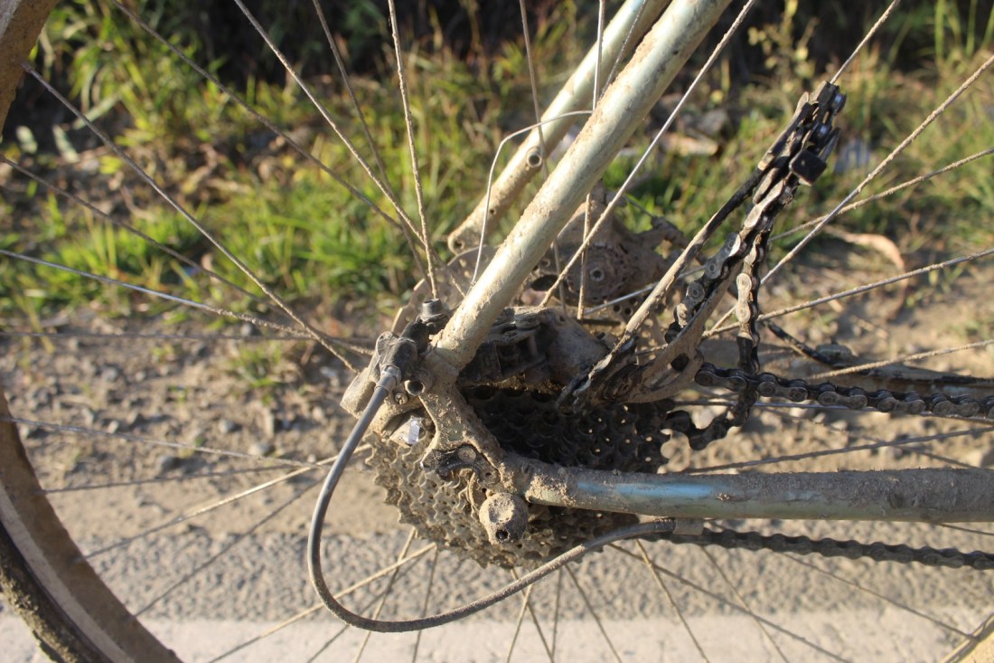 This was something of a problem! Being unable to switch gears wasn’t too much of an issue, but the derailleur also maintains the chain tension. Without it the chain just hangs loose, and won’t stay in gear. I shortened the chain so that it was the right length for my middle gear. This wasn’t perfect and the chain did continue to fall out of gear every few minutes, but it let me catch up to Jamie.