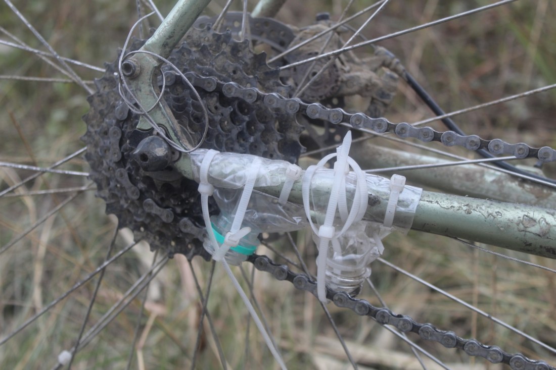 We set off, but my chain still wasn’t properly staying in gear. We spent a long time trying to sort out a solution. The goal was to produce something that would prevent the chain swinging from side to side. Jamie eventually produced a contraption made of plastic bottles and cable ties that did the job.