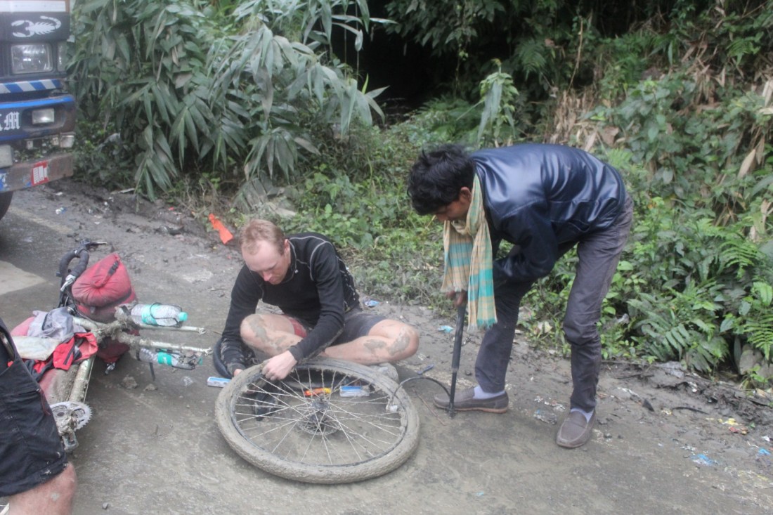 We patched up the tube and I cut some strips from an old inner tube to minimise bulging. There was a friendly Manipuri trucker helping me as I did this. Another guy was very curious about my camera, and took a bunch of photos.