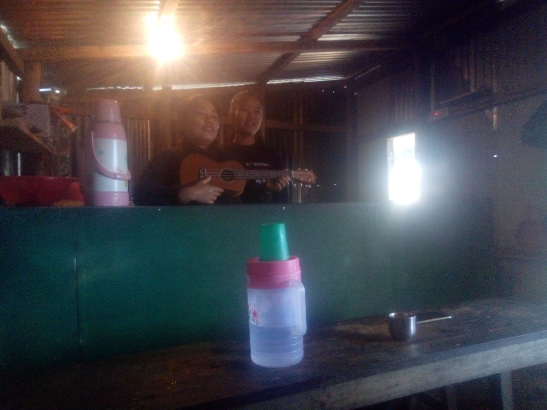 Jamie was waiting for me at a teahouse at the top. We chatted to a man, Naomi, who lived in a village we’d be passing through later in the day. The women working at the teahouse spotted Jamie’s ukelele and asked to have a go.