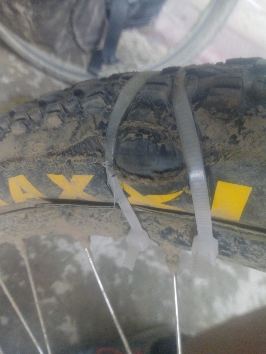 The tube was bulging out through the hole in my tyre. We put same cable ties around it, which did a good job of holding things together.