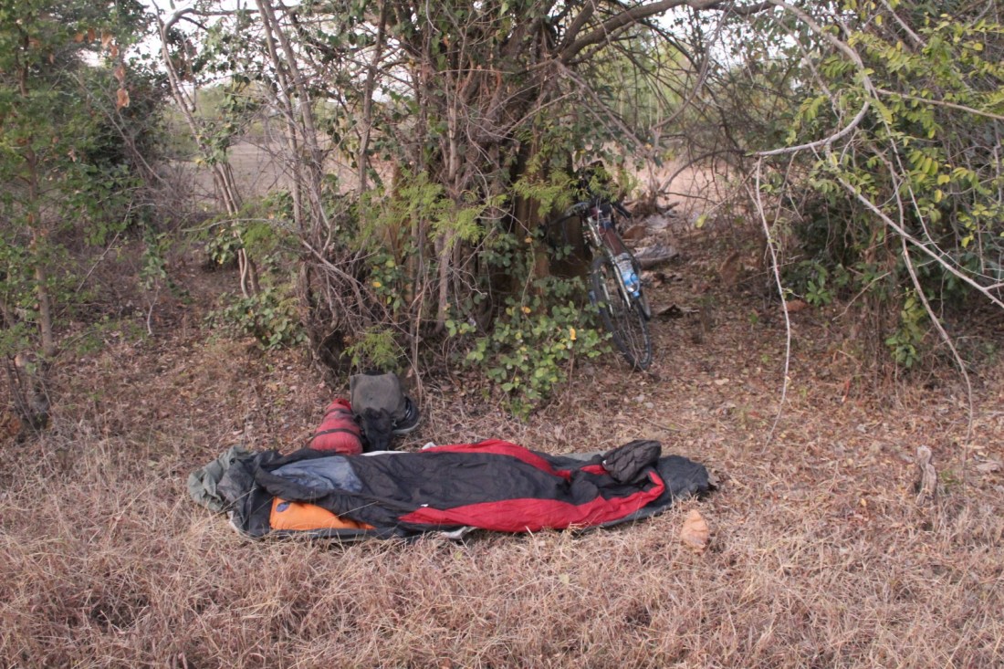 In the end I simply followed a dry riverbed away from the road, at the edge of a field. After a few hundred metres I reached a patch of trees which were to be my home for the night. All the water involved in rice farming meant there were many mosquitoes, so I set up the tent.