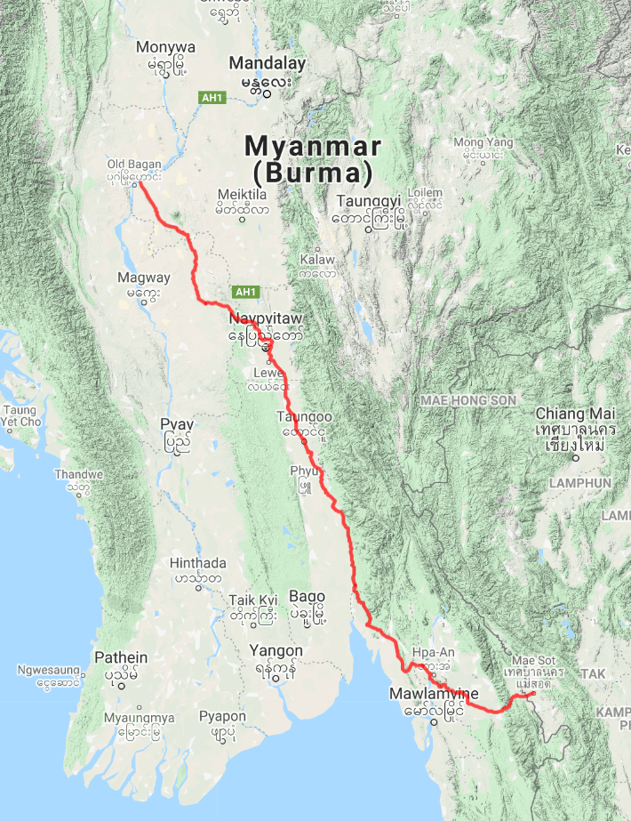 I reached the town of Myawaddy, and rode to the bridge over the Moei river, which marks the border between Myanmar and Thailand. I was soon stamped out of Myanmar and rode across the bridge, swapping over to the other side of the road in the middle.