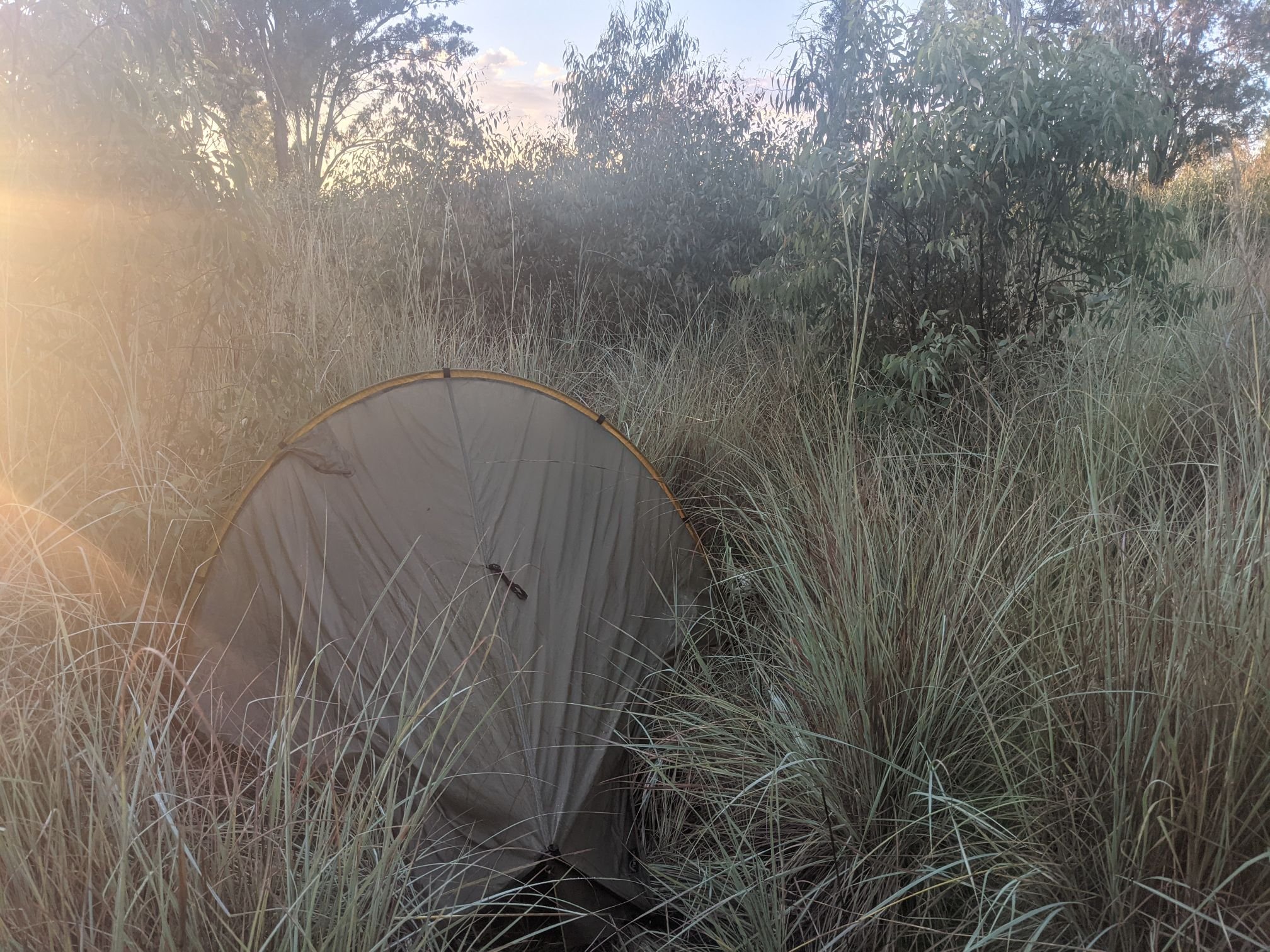 I rode along for another hour or so before setting up camp. There were no gaps in the fence and, where possible, I prefer not to just climb over. I set up my tent behind a tree, fairly well hidden by the long grass.