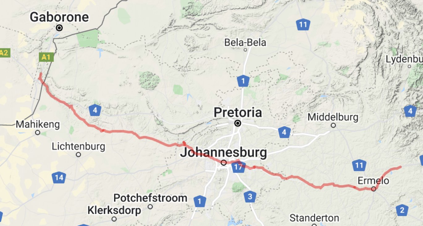 I reached a paved road again at Koster and, after a supermarket stop, continued along. I was heading toward Johannesburg, where I hoped to replace my tyre. I had a look online and found a shop that claimed to stock the model I wanted. I called them up, and asked if they did. I didn’t quite catch what the guy said: “we have …. or ….” It sounded like they didn’t have what I wanted, and were offering alternatives. When I asked him to repeat it, it turned out they did have the exact tyre I wanted, and were offering me a choice of colours! That was very different to shopping for bike parts in the rest of Africa.