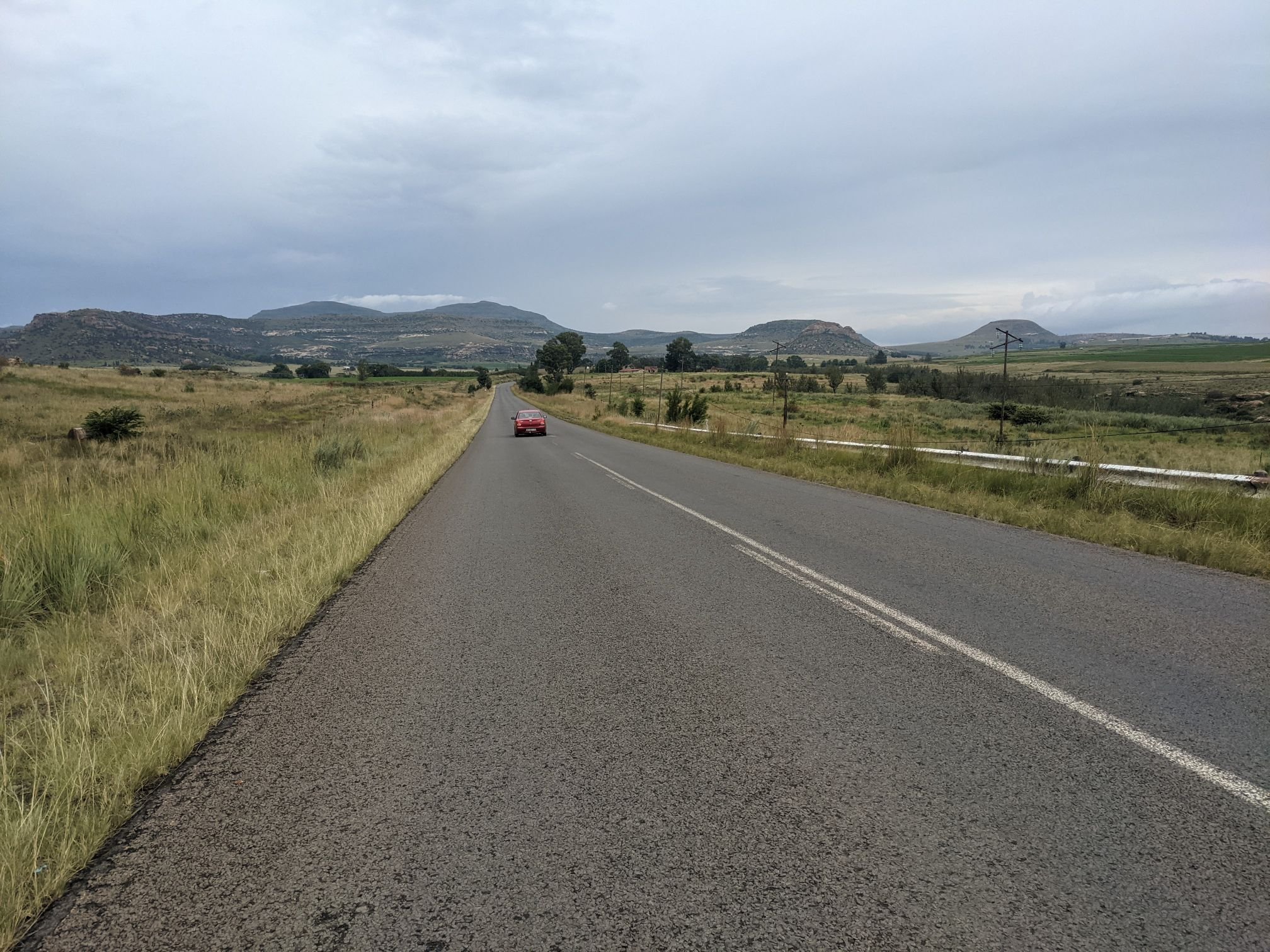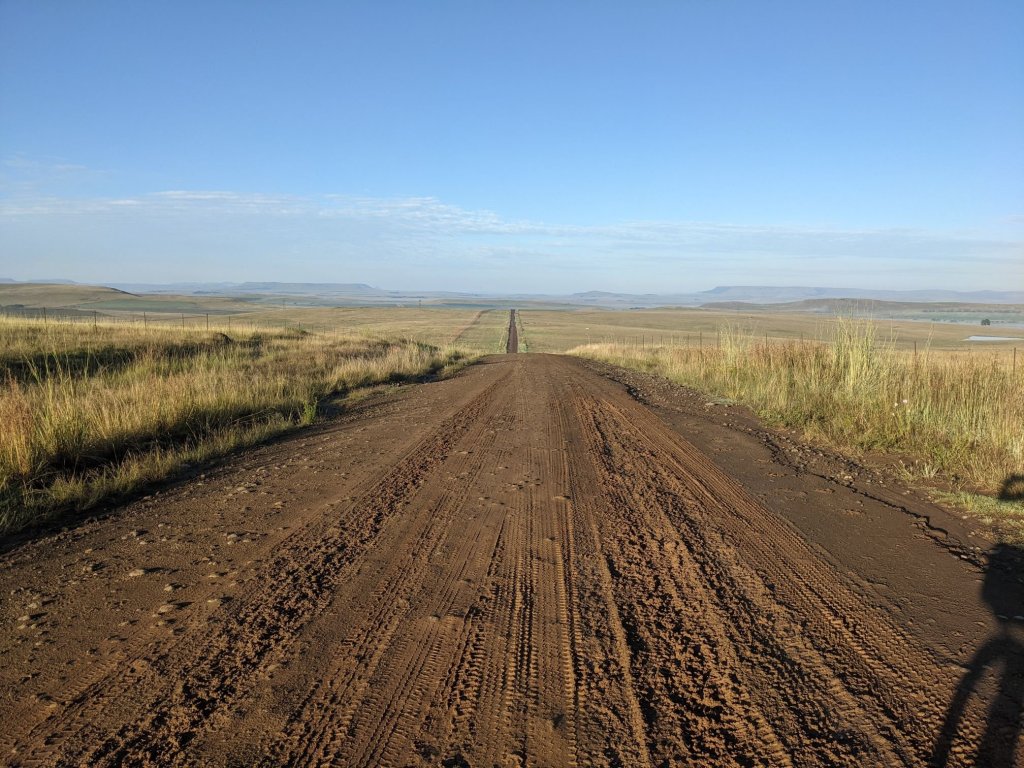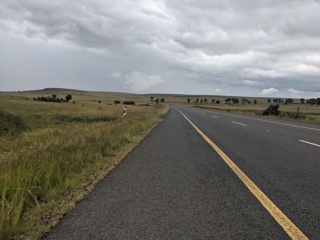 Past Harrismith the road was bigger, and a bit busier. As usual for South Africa fences lined the road. I couldn’t see any alternative but to make my way through a fence to camp. The fence here consisted of 4 lines of barbed wire. At one fencepost, one of the lines was not attached, leaving a gap big enough that my bike and I could fit through. I camped behind some trees the other side of the fence.