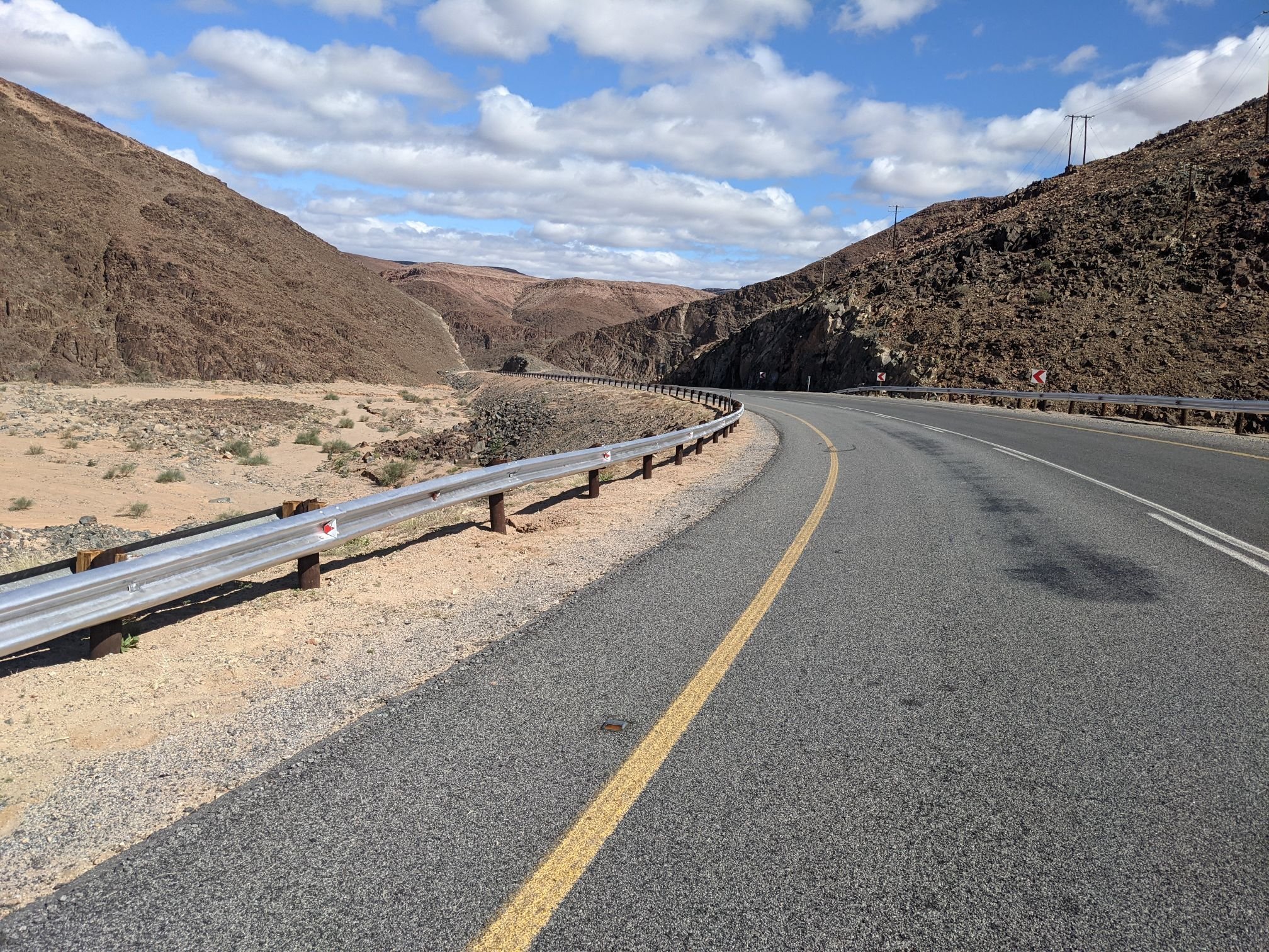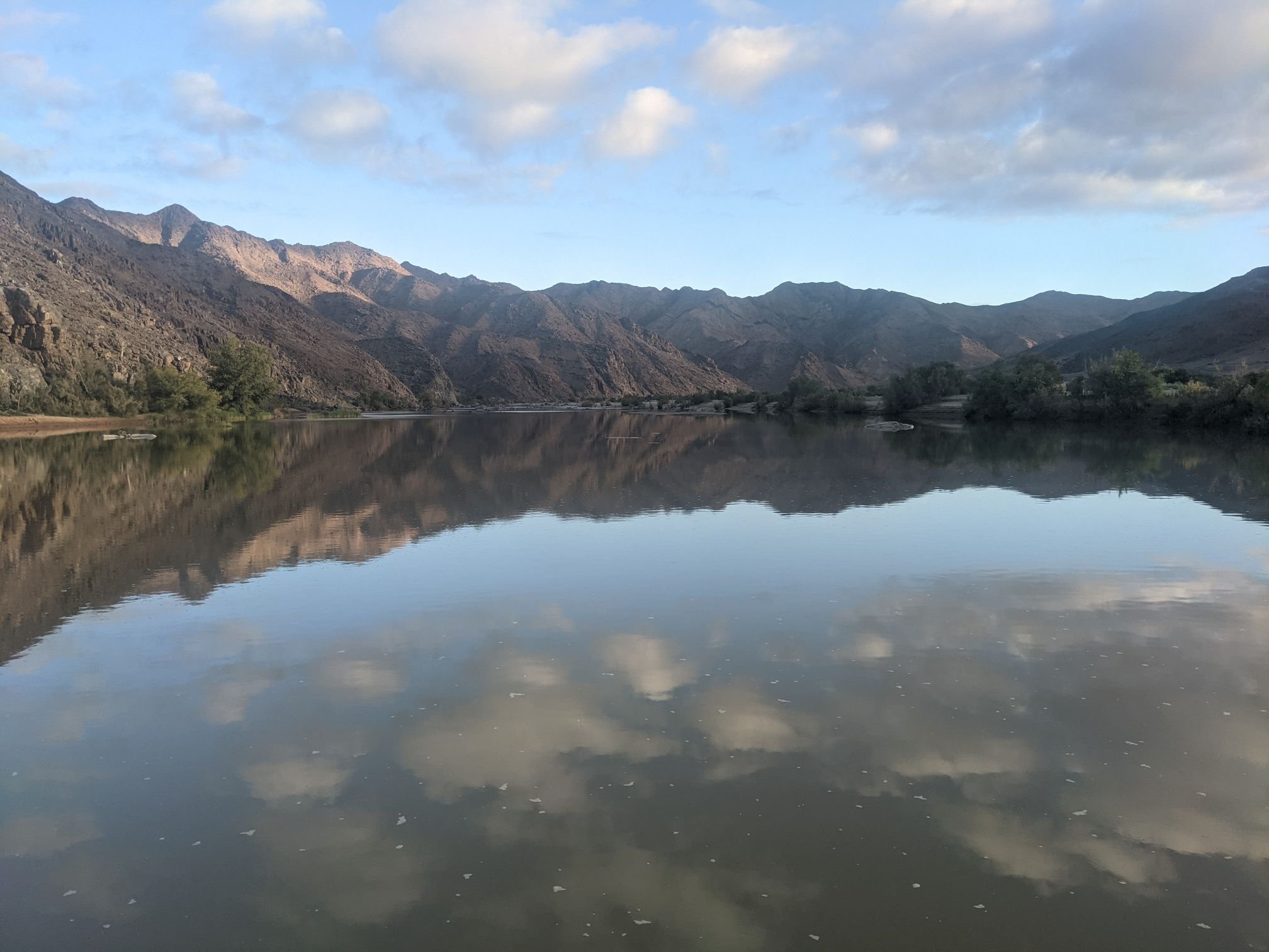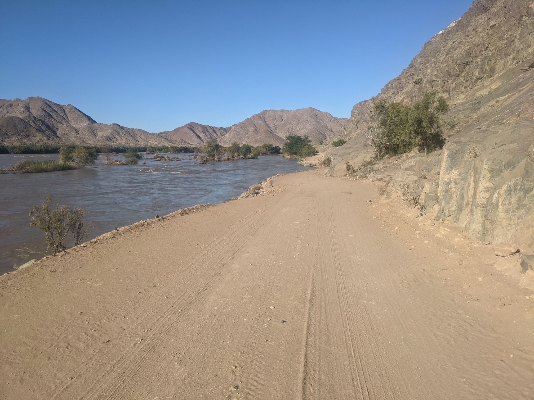 The road descended out of the mountains down to the Orange river, which marks the border between South Africa and Namibia. It was a surprisingly big river given the arid surroundings.