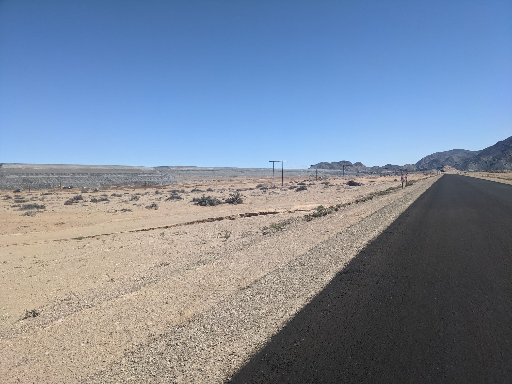 About 10 kilometres after leaving the river behind, I joined a tarmac road. There was a strong tailwind and I flew along, despite the slight uphill. Another 10 kilometres brought me to Rosh Pinah, a mining town.