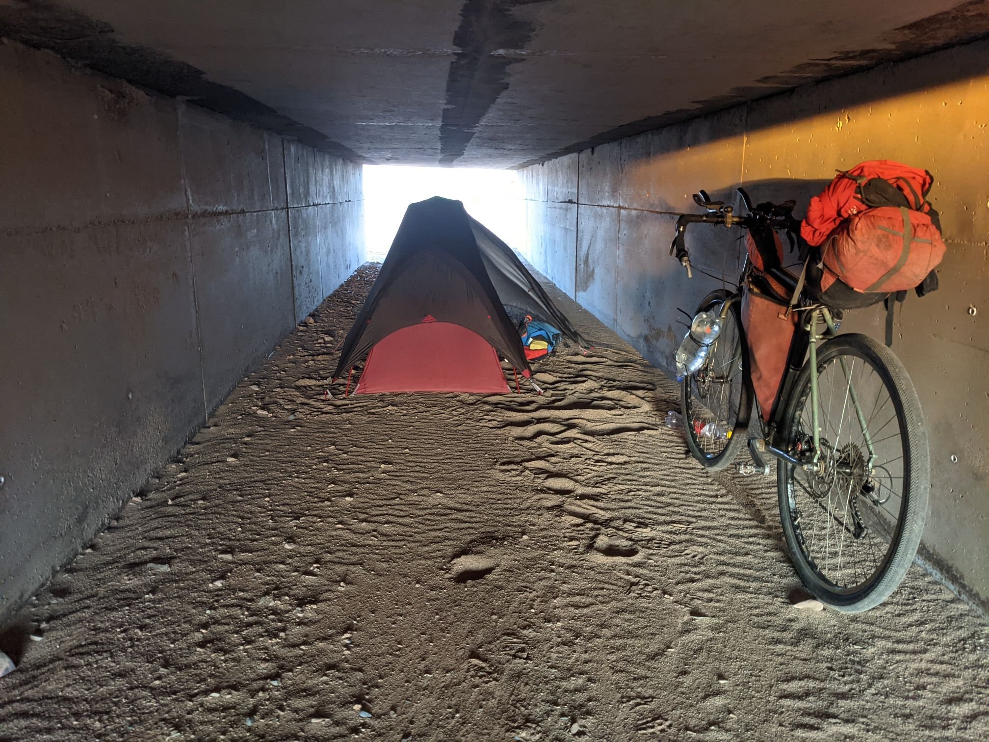 In the evening I climbed down into a drain. Unusually this drain was not perpendicular to the road, instead it was fortunately angled just right to block the wind.