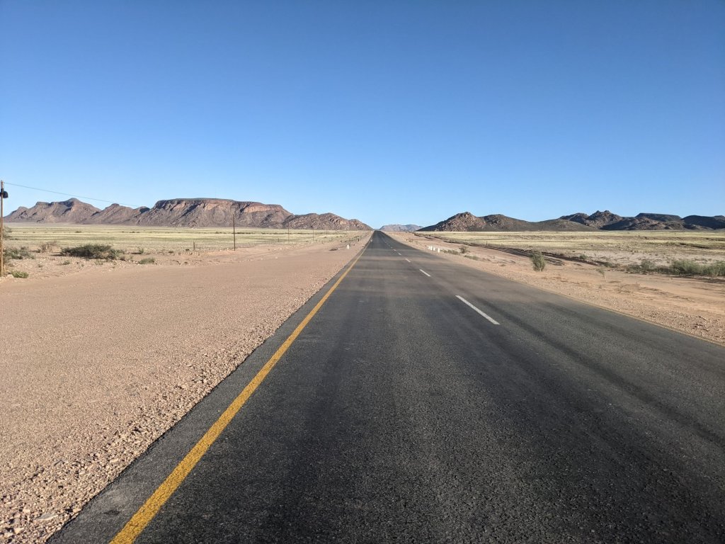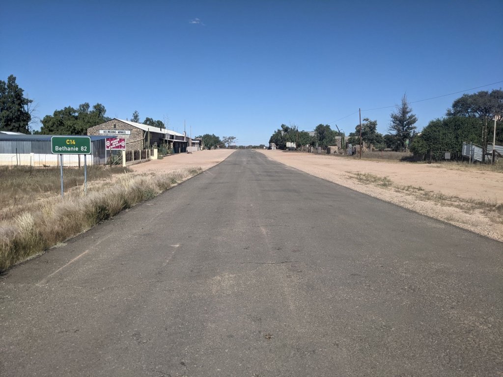 Around midday, the windspeed lessened significantly and I was able to ride at a somewhat more normal pace for the rest of the way to Aus. It was quite a small village but it had a shop, where I bought another day’s worth of food. There was a water tap marked on iOverlander near a (closed) tourist information booth, but the water didn’t seem very clean. I filled up at the police station across the road instead.