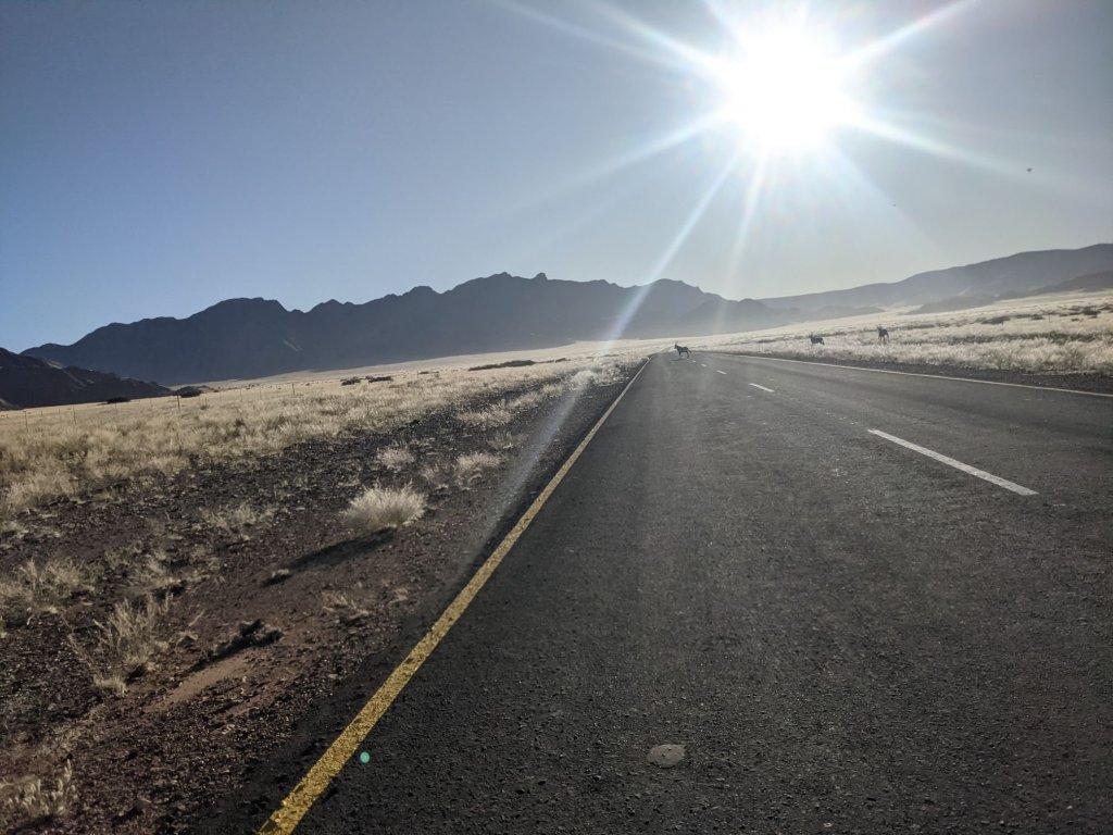 I set off from Sesriem on a road which, rather to my surprise, was tarmac for the first 15km or so. A group of oryx were on the road, and panicked when they saw me. One charged at the fence and rather than jumping, simply crashed into it and basically summersaulted oved. Another tried the same thing and ended up stuck.