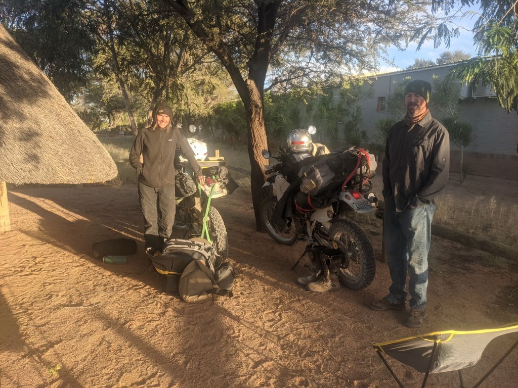 When I did get to Solitaire, I stopped at the gas station – which is pretty much the entire village. There was a shop as well, where I bought some snacks and sat down to eat. While I was there, Sal and Ethan arrived. I’d been planning on riding on further but decided it’d be nice to spend some more time with them, so I joined them at the attached campsite – which offered a reduced rate for cyclists/motorcyclists! The restaurant offered steak and chips which we were very tempted by, but they were targeting the more upmarket travellers and it was a bit too expensive for us.