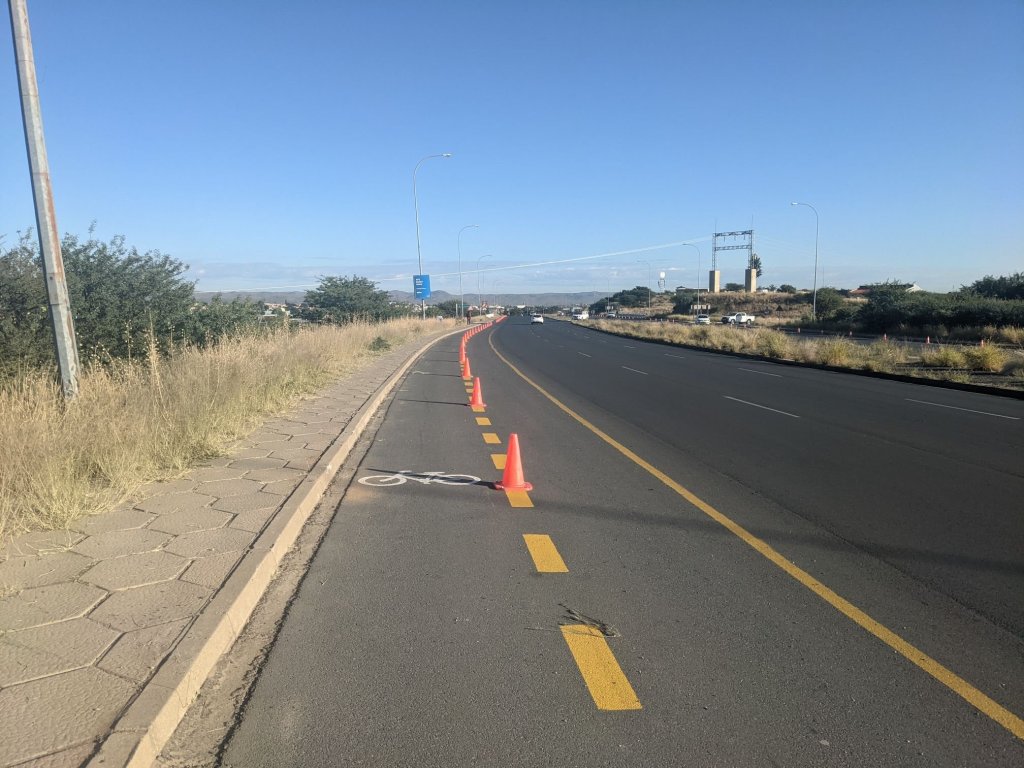 I rode out of the city on a road with, wonder of wonders, a usable cycle lane. Cones kept vehicles out of it while pedestrians walked on a separate pavement.
