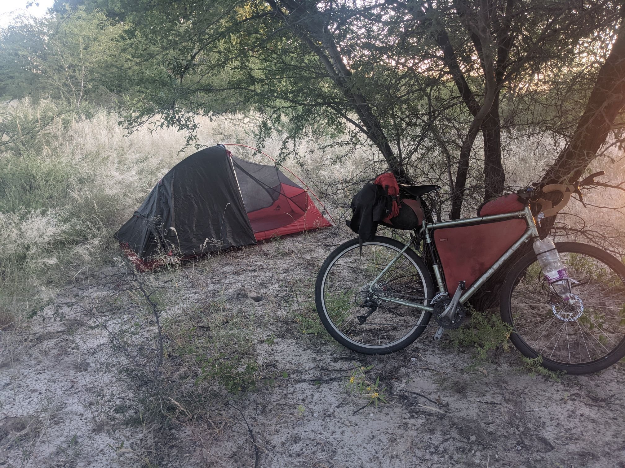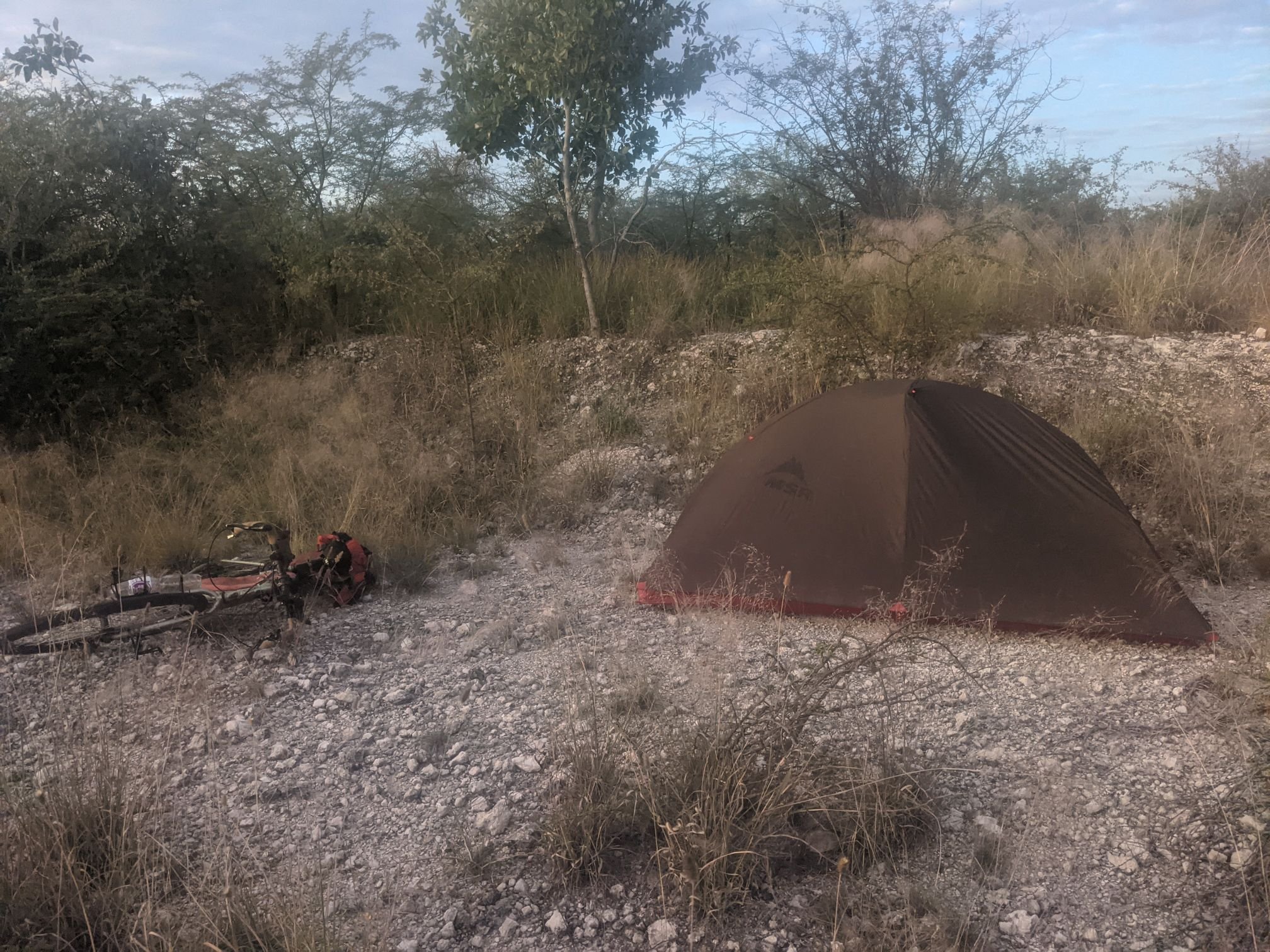 Naturally this makes wild camping difficult. Even if I could see somewhere where I’d be out of sight, I’d be watched on my way there. At one point I saw somewhere promising but, after looking around, I saw a man watching me, sitting in a tree. Eventually I found a moment where I wasn’t being watched, and followed a little-used track. I hopped over a fence into an overgrown area and pushed/carried my bike to a clear spot with relatively few ants. I set up my tent with the rainfly half-off again – this gives most of the airflow benefit, while being very quick to put on the rest of the way when temperatures drop.