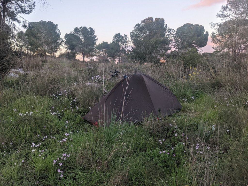 In the evening, as I cycled along I saw some woodland a few hundred metres away on the other side of the road. My map showed footpaths leading in there, so I made my way over and set up camp.