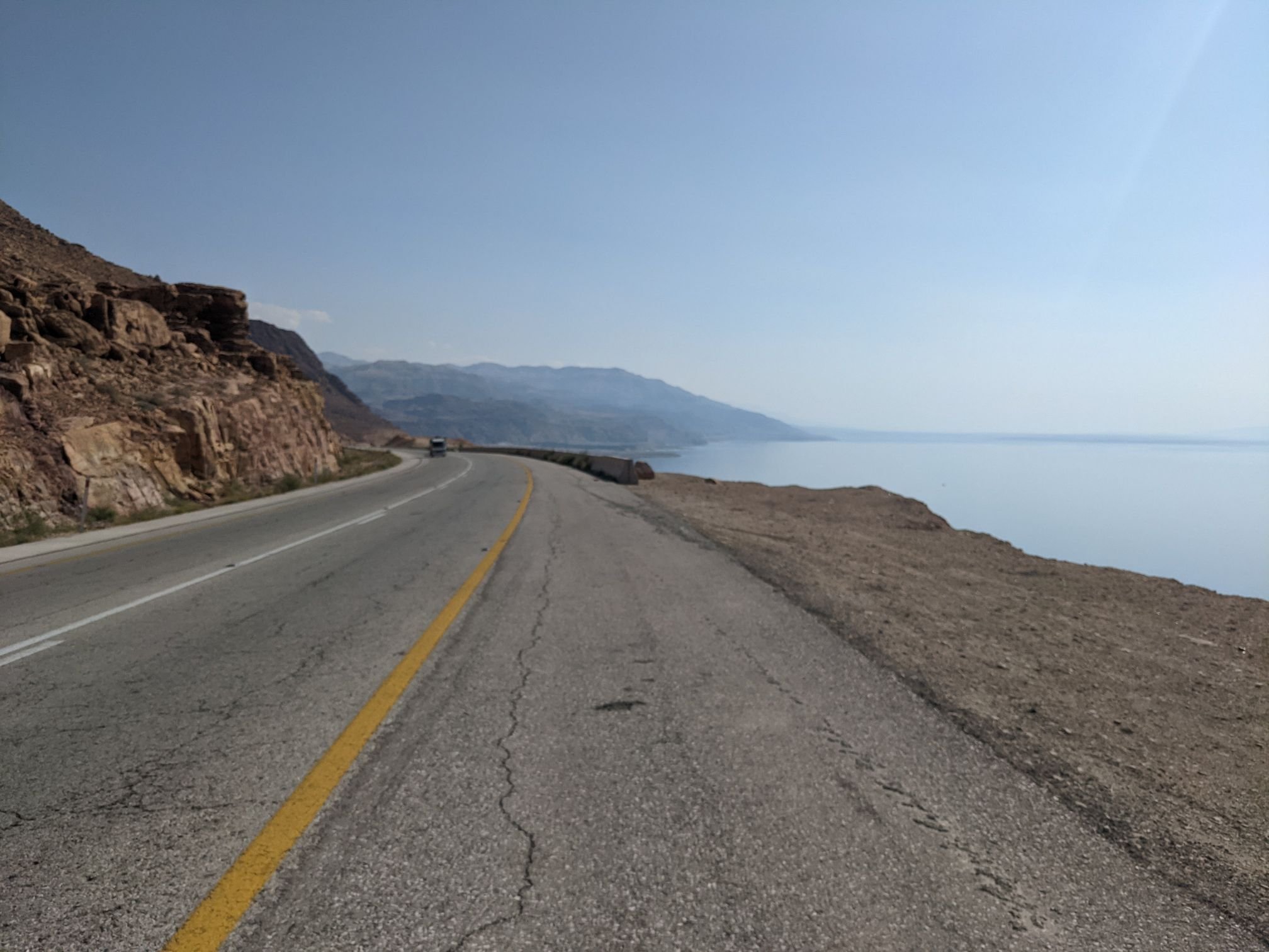 I rode along the Dead Sea for a few hours. Most of the way the mountains came right to the sea, but there was a large, flat section at the mouth of a (dry) river. Here there were some fields and a village.