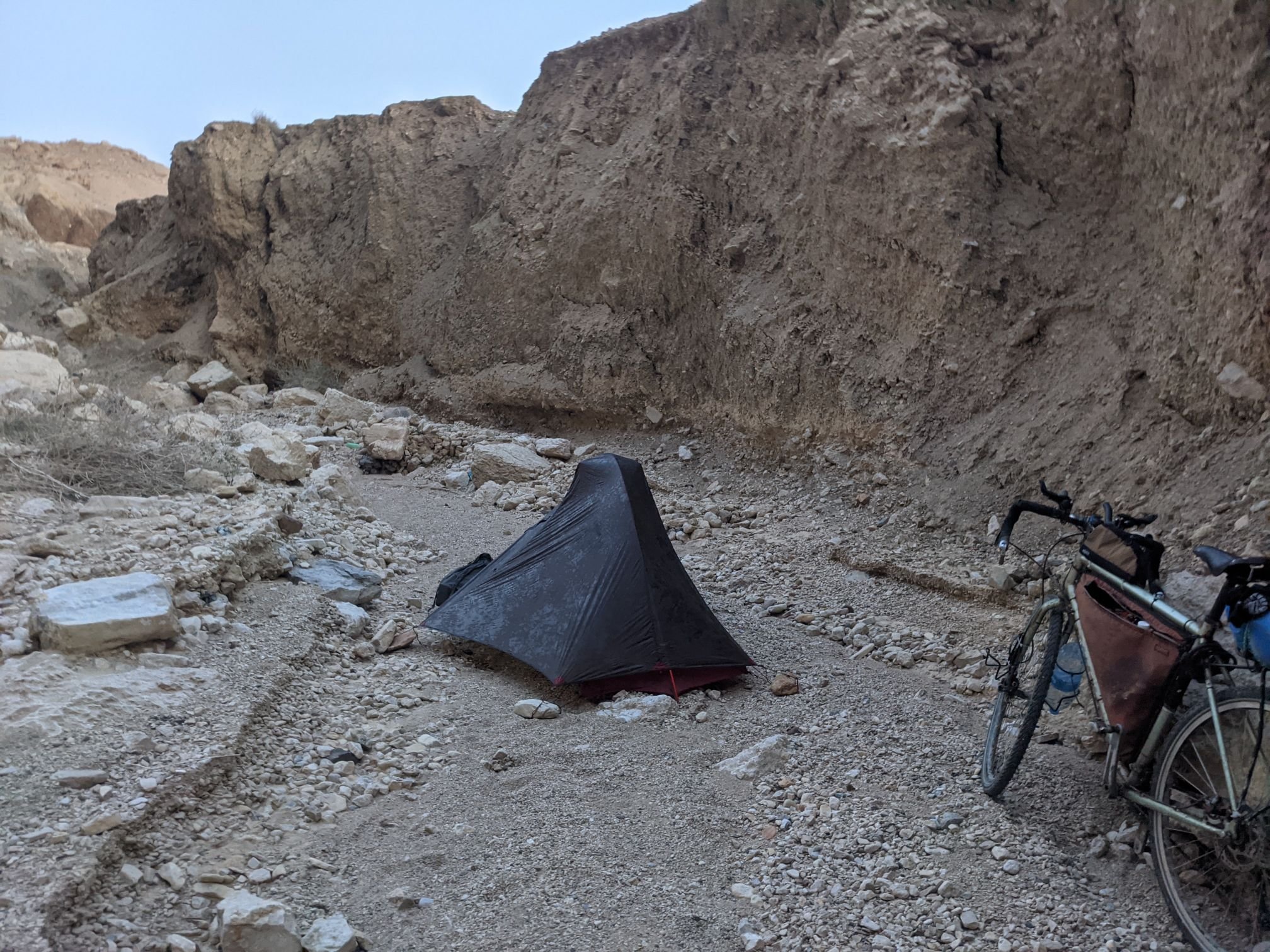 At this point I turned away from the Dead Sea and began cycling up into the mountains. I’d climbed up about three hundred metres before I decided to find somewhere to camp. The riverbed formed a bit of a gorge, hidden from the road. I managed to clamber down there and set up camp.
