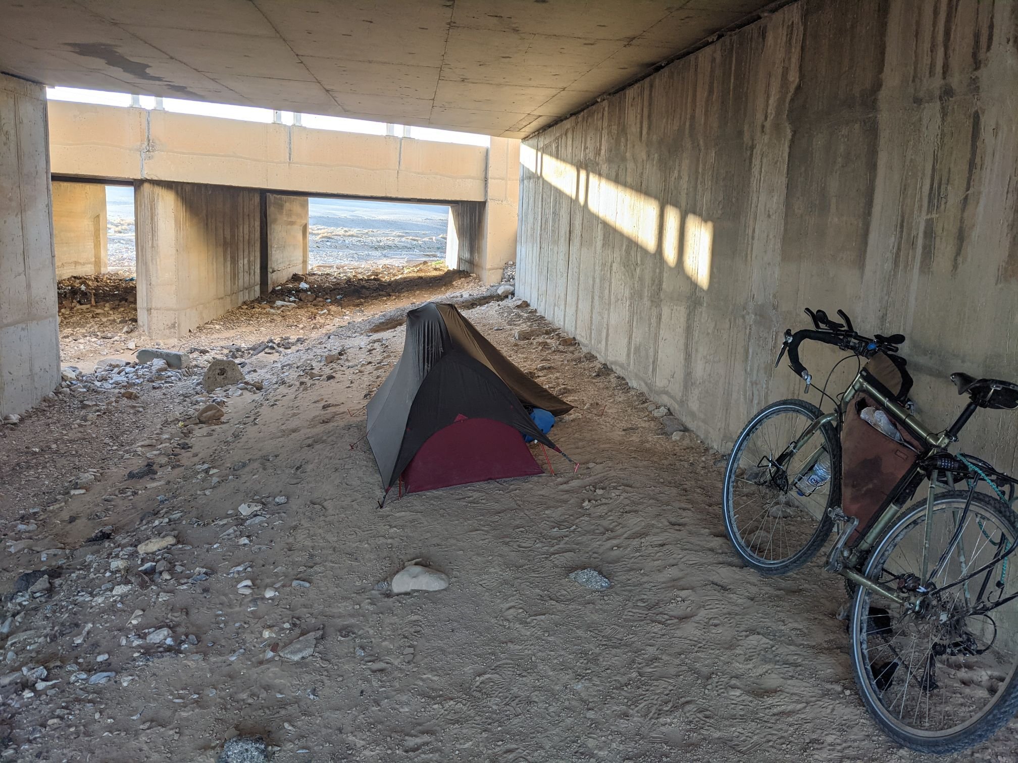 After a time I reached a highway, the aptly named Desert Highway. I rode south for a couple hours before setting up camp under a bridge, in a dry riverbed.