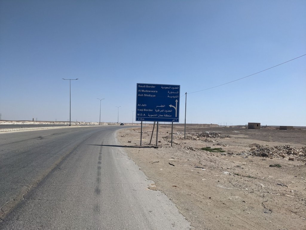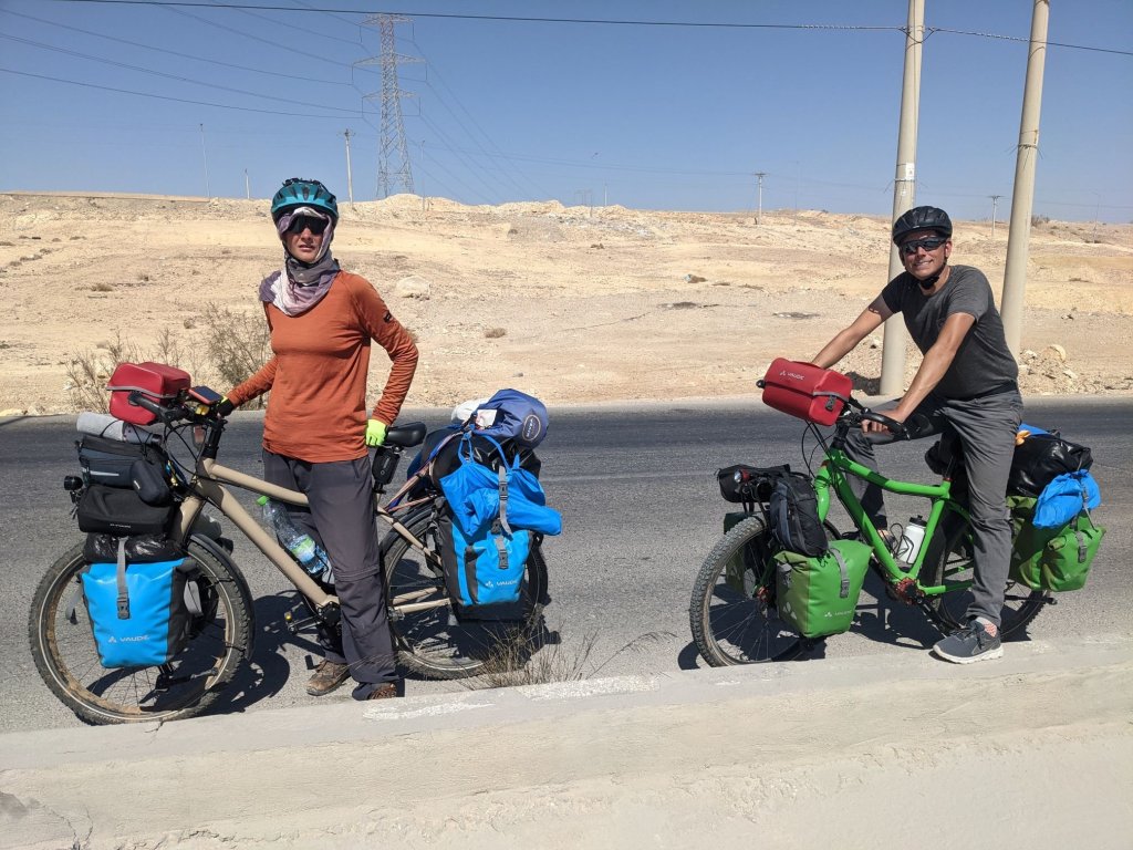 In the morning I continued cycling along the highway for a while, before reaching the town of Ma’an. I stocked up then set off cycling south. On the way out of town I saw two touring cyclists going the other way, and stopped to chat. Verina and Niklaus, from Germany, were cycling around the world. Like me, they planned to go to Saudi Arabia, but they intended to visit someone in Ma’an first.
