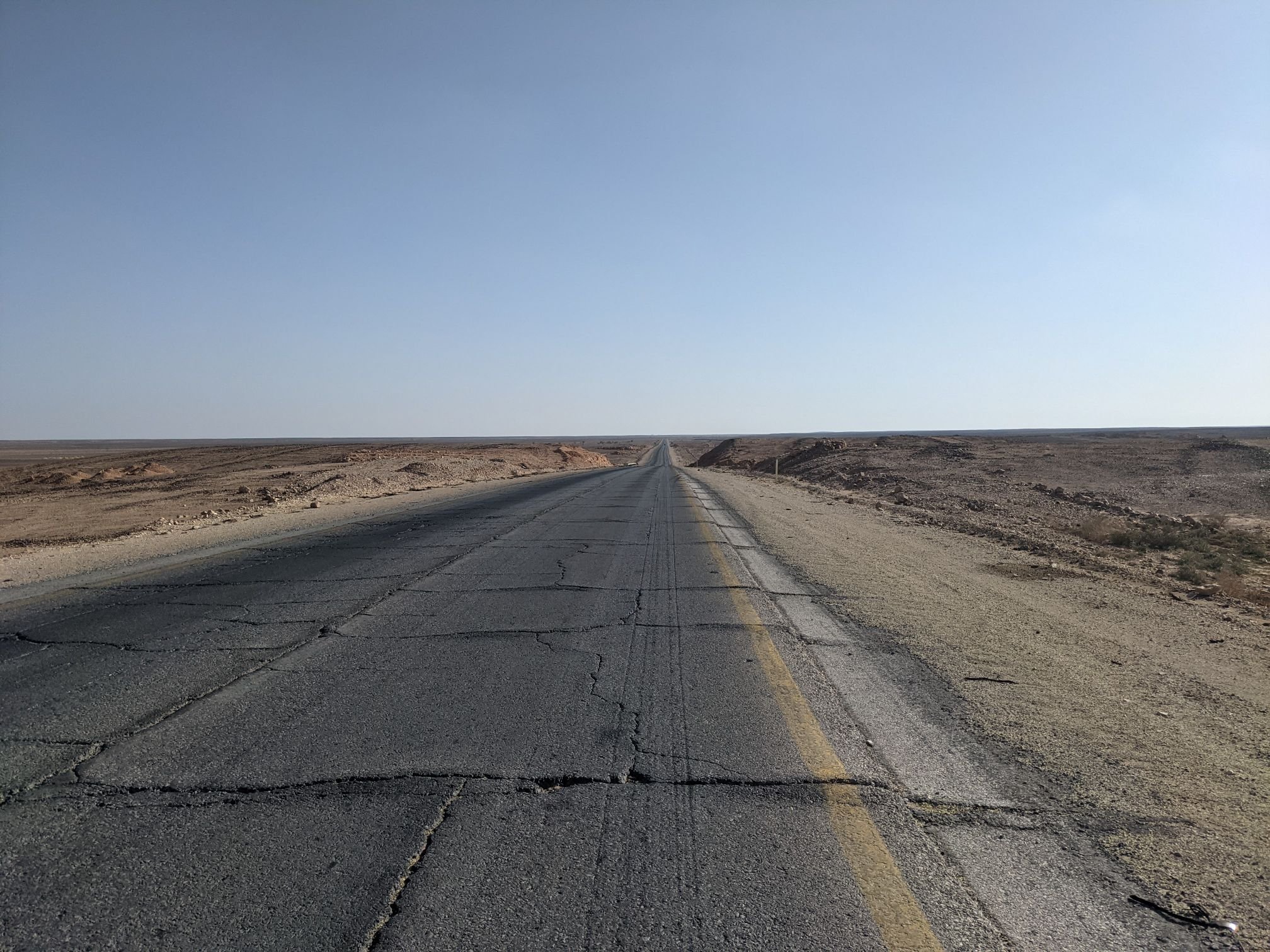 Then I took a turning off the highway heading east. The road was much quieter here. I rode past a few villages, and some grassy fields. As I continued east the grass reduced as I approached the desert. One section of the road was unpaved (albeit very smooth) and it felt very nice to be out there in the middle of nothingness on this dirt road with just my bike for company.