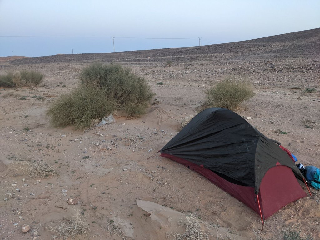 I passed a police checkpoint in the evening and the road improved very slightly from there. I cycled until I reached a dry riverbed, and wandered along to reach some bushes that would provide a little shelter for my tent.