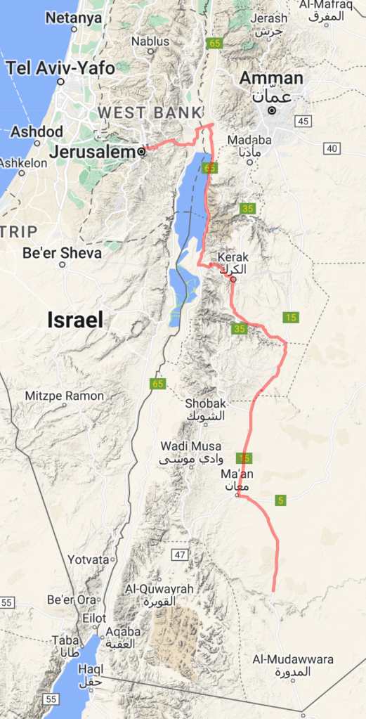 I reached the border and took a taxi to cover the last couple kilometres that I wasn’t allowed to cycle. Leaving Israel my bike didn’t need to be scanned – this time the delay was in paying a “Passenger Fee” – an exit tax, really. The queue for this moved inexplicably slowly but eventually I was through, paid, and was allowed out. I bought a bus ticket (again, not allowed to cycle) and we started heading over to the Jordanian side.