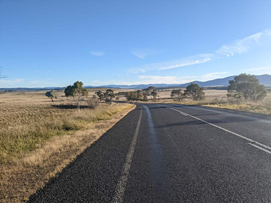 After the pass I descended gradually before the road gave way to rolling hills. An hour or so before I reached the town of Cooma, it began to rain, lightly and intermittently. I stopped at a campsite. The forecast for the next day was rain with the temperature peaking at 4°C, so I’d decided to take a day off.