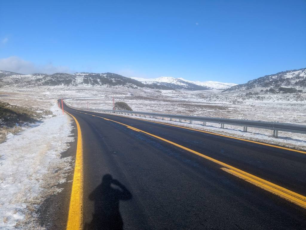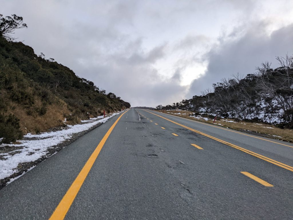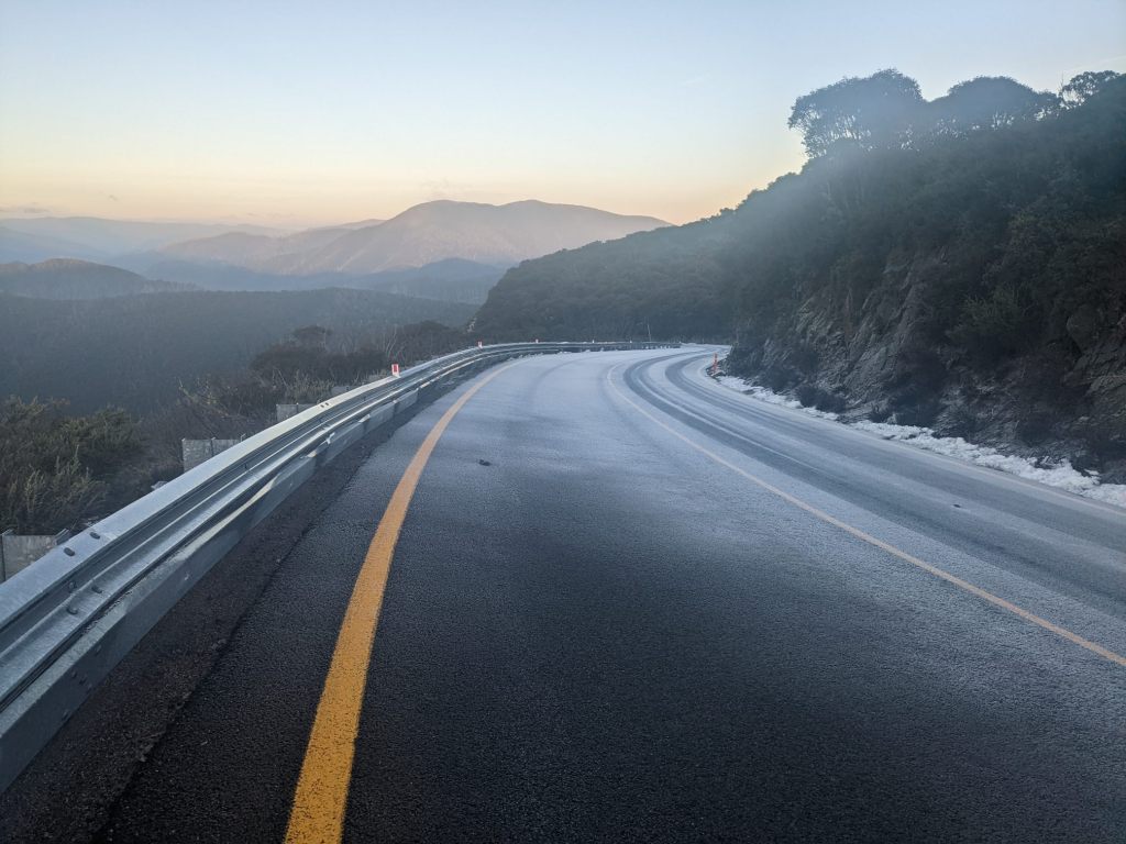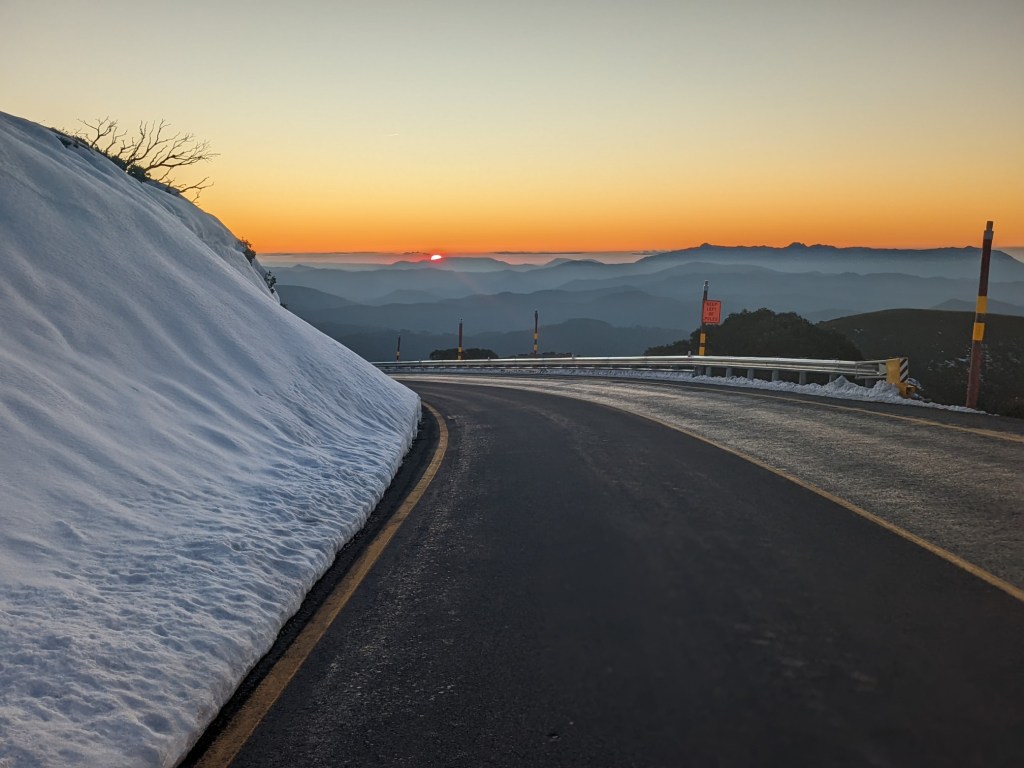 As I rose higher, I again began to see snow beside the road. I passed through a ski resort village, Hotham Heights, before passing just below the mountain’s peak, at an elevation of over 1800m. The sun was setting as I reached the summit.
