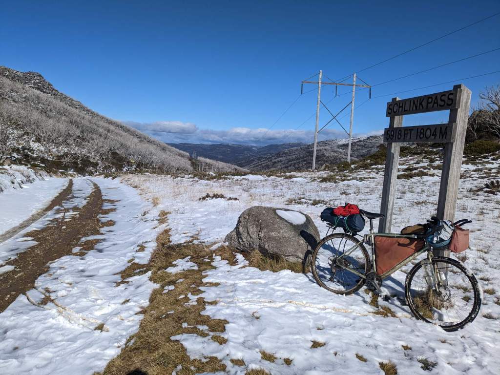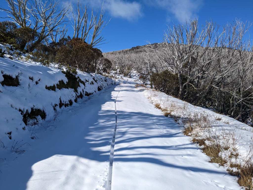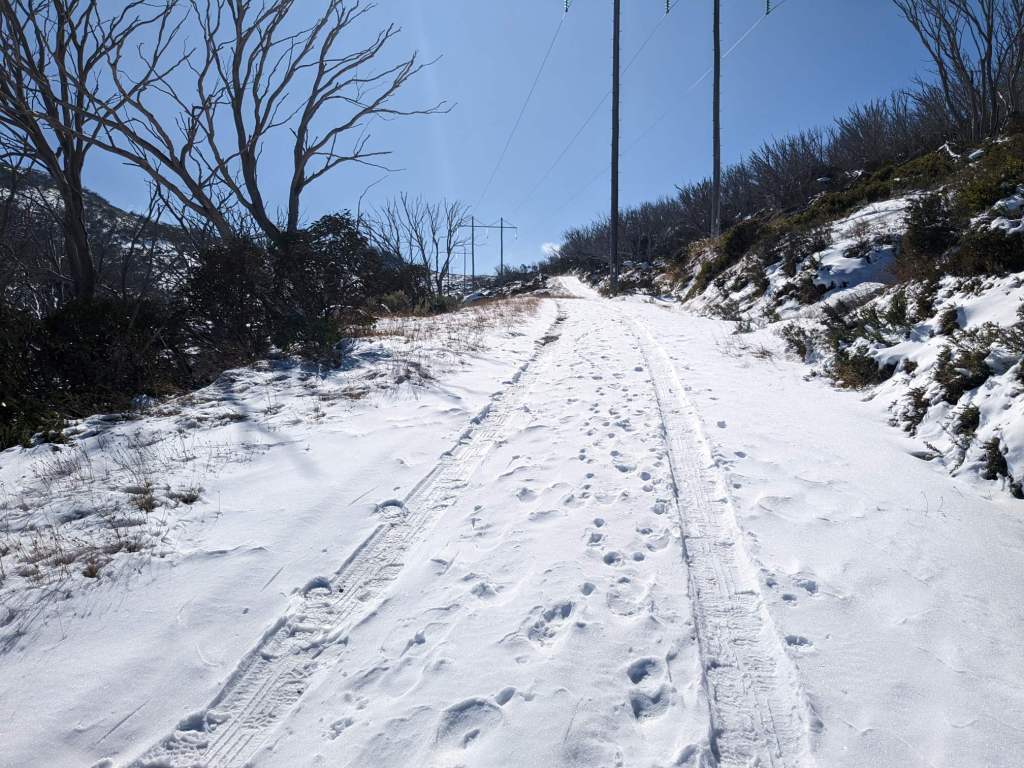 The gravel trail was covered in snow. I rode along it for a bit but the snow got deep enough that it wasn’t really possible to ride. I considered what to do. If the gravel trail had been ridable but the summit walk closed, I’d have continued. If I’d had to walk the whole way, but the summit was accessible, I’d have continued. But I didn’t really want to walk 16 kilometres and still not reach the summit.