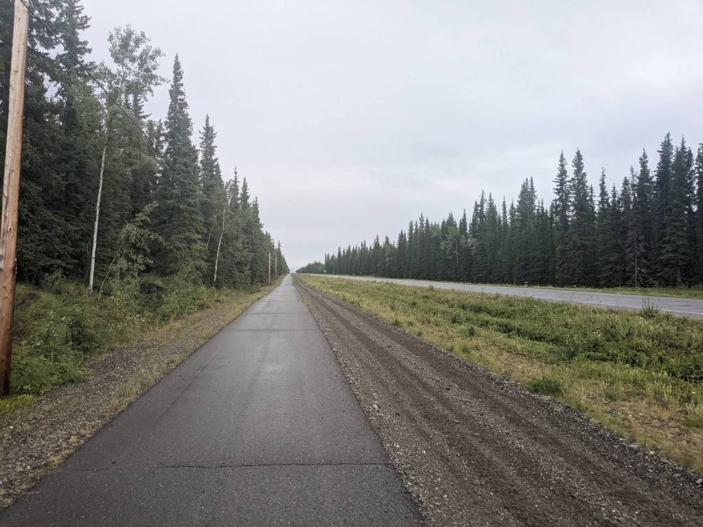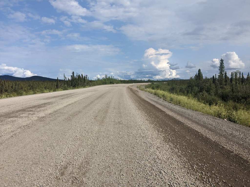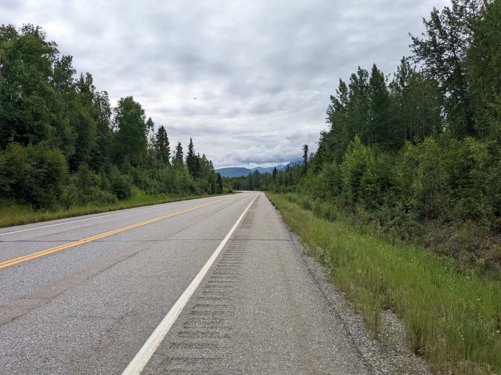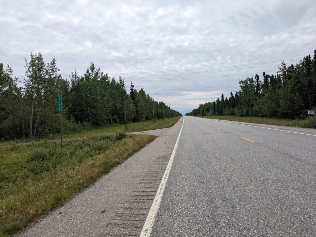 From Delta Junction I joined the Alaska-Canada Highway. Road signs began counting down from 1400 miles. The road was now flat and a gentle tailwind pushed me along.