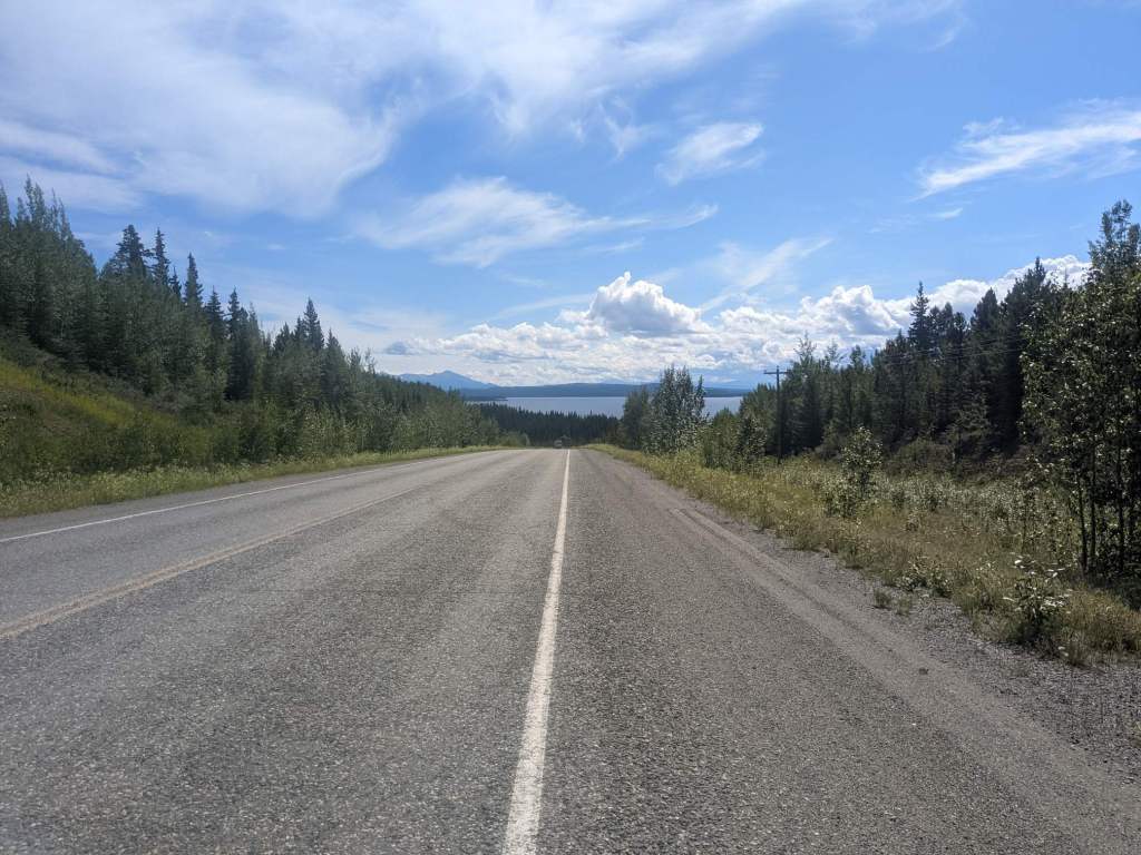 We rode on a little longer before wild camping on the shore of a lake. I set off alone the next morning because I wanted to have a rest day, which meant arriving in the next town relatively early. The strong headwind made that a bit of a struggle but I did manage to reach Haines Junction in the early afternoon, and checked into a hostel.