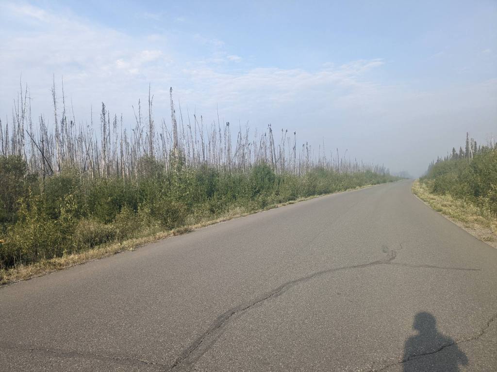 My first morning on the Cassiar Highway, the sky was hazy with smoke. The trees were empty of leaves and branches, and coloured grey. Forest fires were very much in evidence!