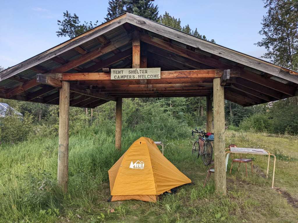 I wasn’t planning on hitchhiking anyway; I continued cycling as usual. Well, apart from the fact that I’d decided to have a half-day and stop early at a campground. I arrived at Witset campsite in the early afternoon and found a sign stating that the owner had gone out until evening, and to just pitch up anywhere. There was a woman nearby and I asked if she knew the wifi password. It turned out she was the owner, just on her way out. I said I’d come by the office to pay later but she said I could said I could stay for free! That was very kind of her. Laundry and showers were free too so I doubtless smelled much better when I left the next morning.