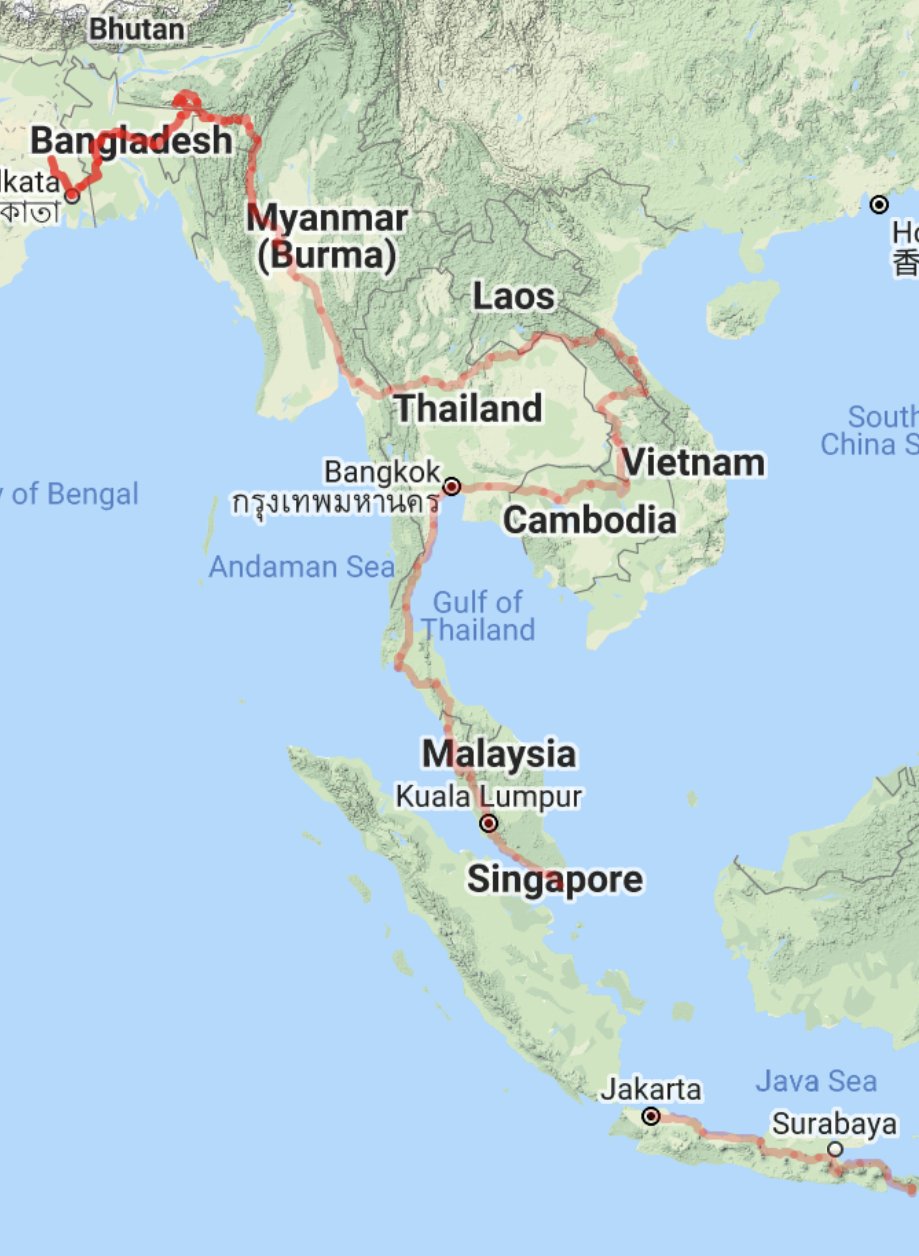 Southeast Asia: Calcutta to Bali. Jan-Mar 2021. 9075 km