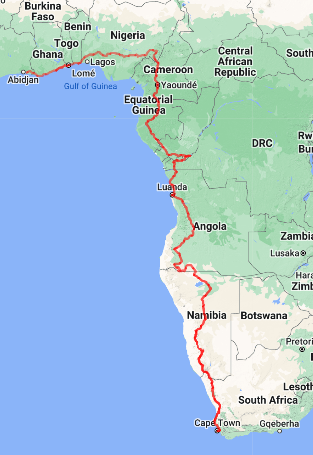 Heading back north: Cape Town to Ivory Coast. 9974 km.